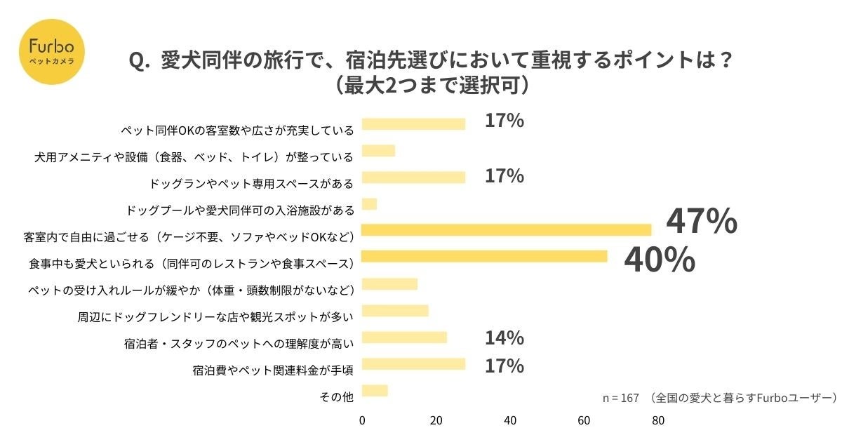 愛犬同伴の旅行において、宿泊先選びで重視するポイントについて尋ねたところ、「客室内で自由に過ごせる(ケージ不要、ソファやベッドOKなど)」が47%、「食事の際も愛犬と一緒にいられる(同伴可のレストランや食事スペース)」が40%と、愛犬がストレスなく、飼い主と一緒に過ごせる環境を重視する人が大多数であることがわかりました。