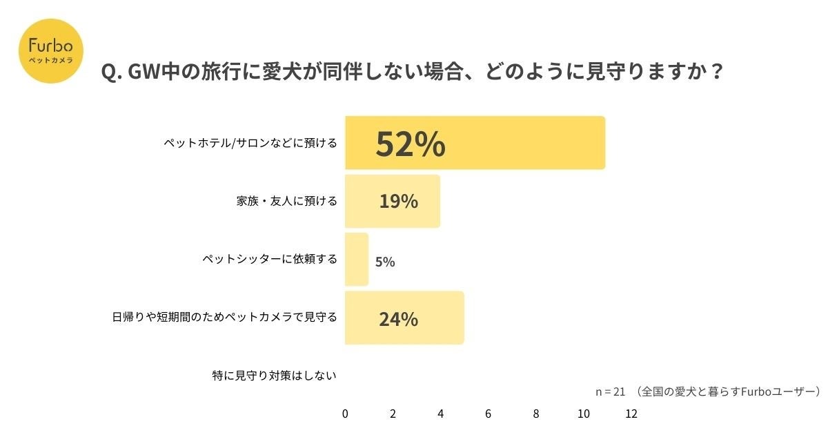 一方で、旅行に愛犬を連れて行けない場合、「ペットホテルやサロンに預ける(52%)」が最多となりましたが、「日帰りや短期のためペットカメラで見守る(24%)」という回答も目立ちました。