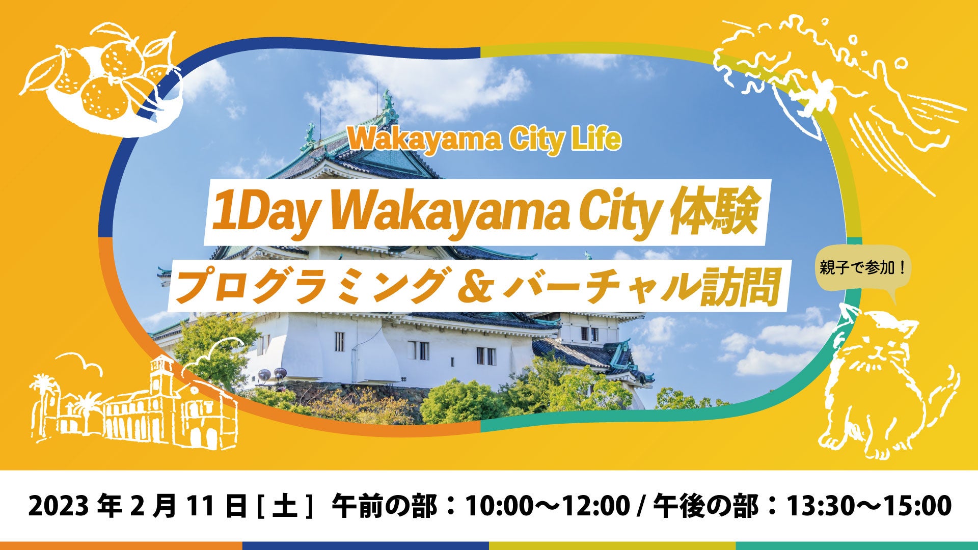 2月11日(土)に開催する第2回の1Day Wakayama City体験!では、午前の部で和歌山城を題材にプログラミングに触れてもらうオンラインスクール型交流イベントを実施。午後の部は、サイトやパンフレットだけではなかなか知りえない和歌山市の情報と映像を体験!