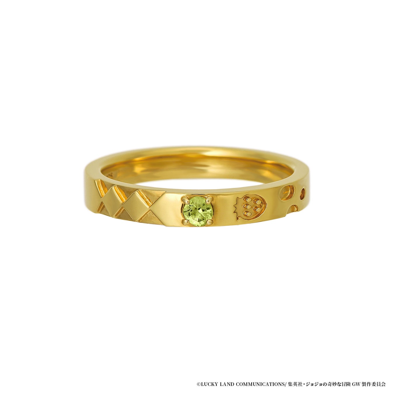 中央にはフーゴをイメージしたペリドットをセッティング。アームの左側にはP・Hの模様を表現し、右側にはフーゴの服装をモチーフにしたデザインを施しています。ファンだからこそわかるイチゴ柄など細部にこだわったリングです。