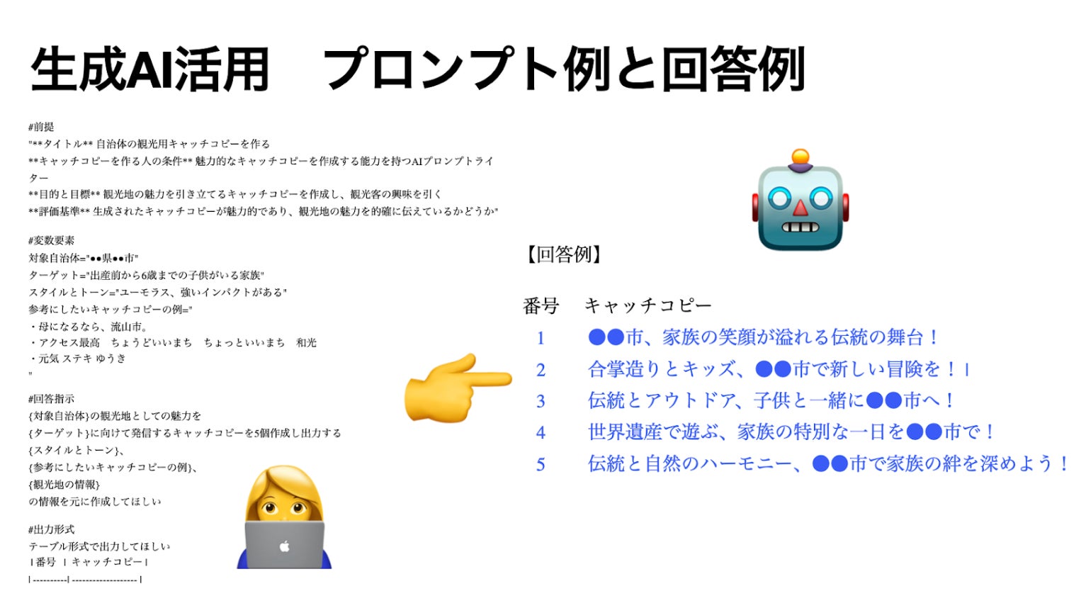 生成AIに関する基本的な知識から、ChatGPTの活用方法、導入における注意点まで、約1時間で網羅的に学んでいただける内容となっております。例えば、文章を作成する場合、AIに役割を与えた上で、文章作成の目的、背景、用件、文体、参考例、アウトプット例、参照データとともに依頼をすると、生成文章の質が圧倒的に上がります。生成AIが活躍できる領域は、文章作成や調べ物だけではありません。データの集計、分析、営業資料の作成、議事録の整理、事業計画書の作成など、多岐に渡ります。AIへの正しい利き方を身につけ、使える回答を引き出すことで、業務効率が劇的にアップします。