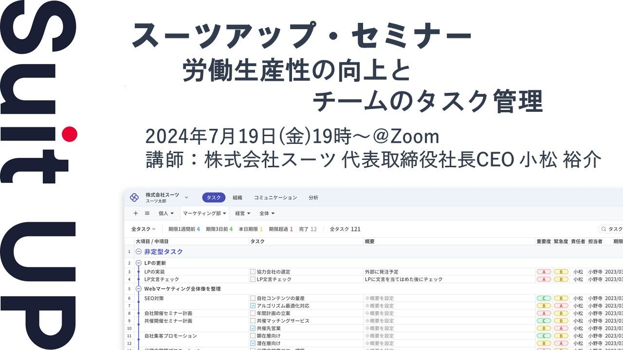 株式会社スーツ(所在地:東京都千代田区、代表取締役社長CEO:小松 裕介)は、2024年7月19日(金)19時から、当社代表の小松が講師を務めるスーツアップ・セミナー「労働生産性の向上とチームのタスク管理」を無料開催します。