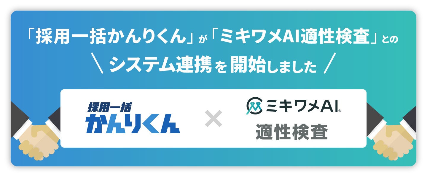 本連携により、「採用一括かんりくん」の管理画面上から「ミキワメAI 適性検査」の受検URLの自動発行、受検ステータスの検索、および検査結果の閲覧までがシームレスに行えるようになります。
