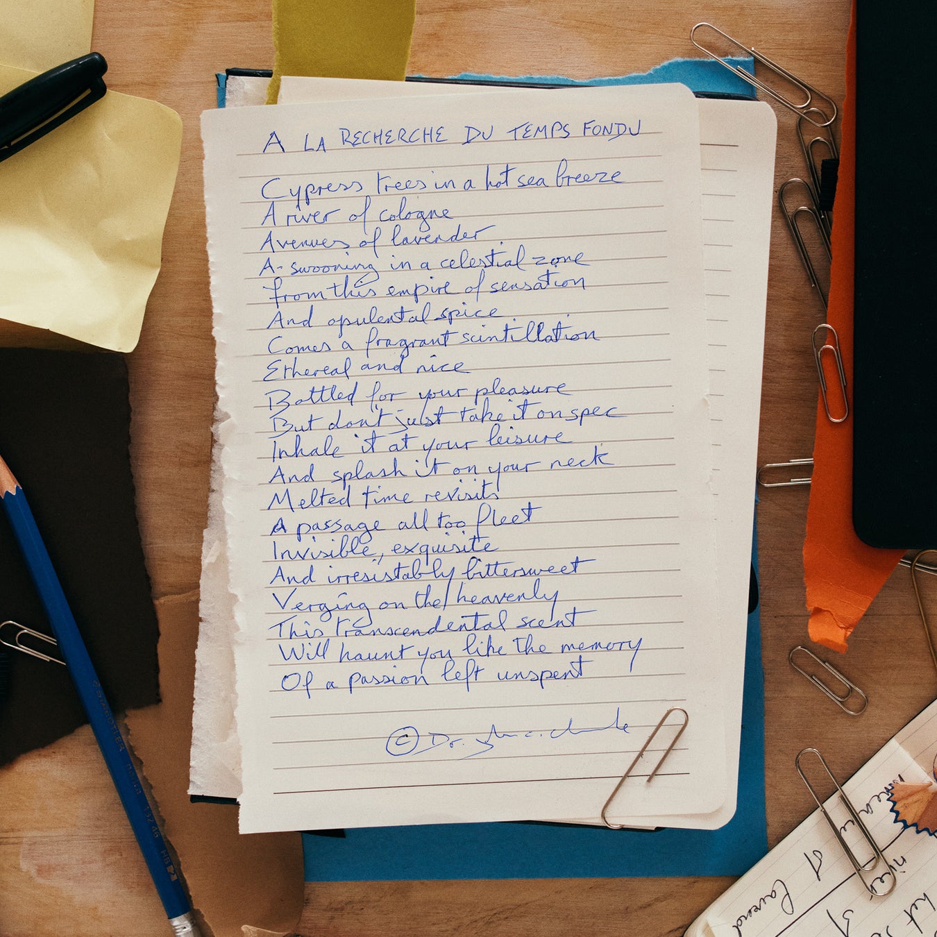 クーパー・クラークの詩『À la recherche du temps fondu』は「溶けた時を求めて」と訳され、マルセル・プルーストの『失われた時を求めて』へのオマージュです。クーパー・クラークの詩とプルーストの小説はどちらも記憶のテーマを探求しており、これはモルトンブラウンと「Artists of Note」にとって重要な物語です。「特定の香りは、あなたを別の時間と場所へと運びます」とクーパー・クラークは述べています。「私にとって、それは自転車屋とクラシックカーのインテリアです。革とガソリンの残り香。それは私にとって非常に感情を呼び起こすもので、車に乗ってどこかへ向かっていることを意味していました。願わくば、海辺へ。」