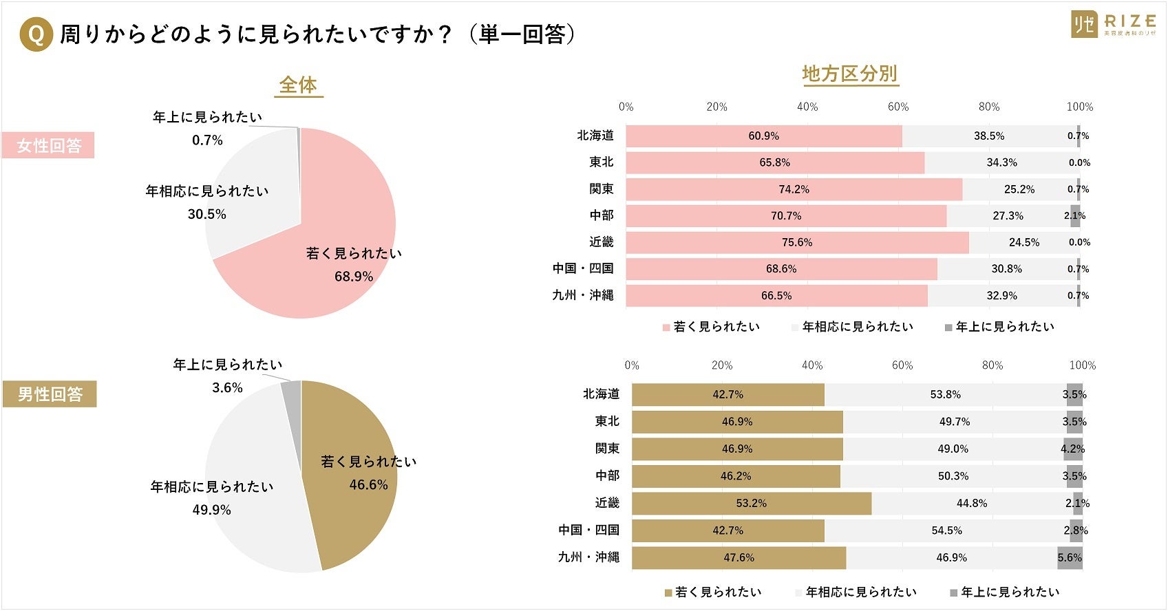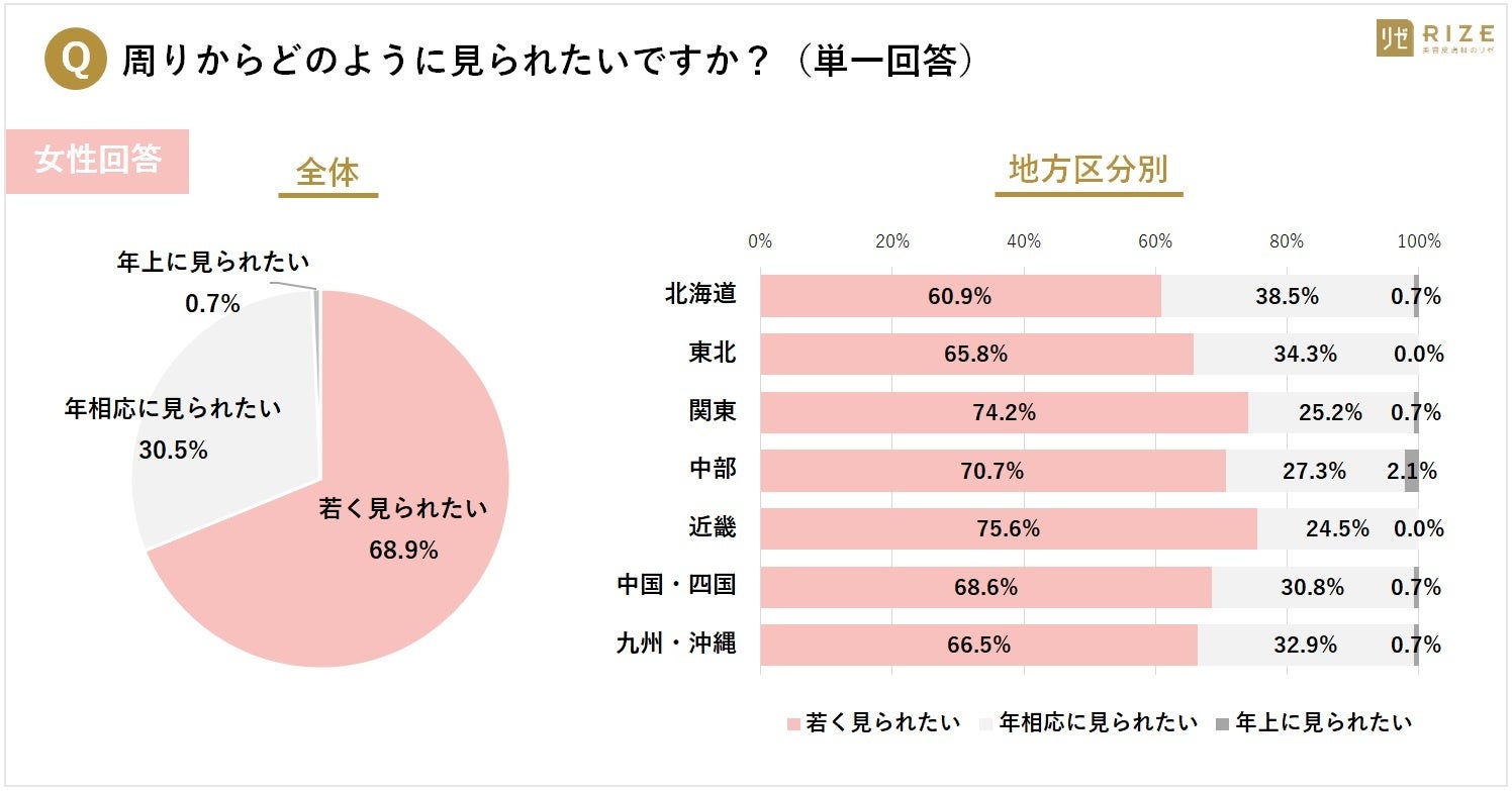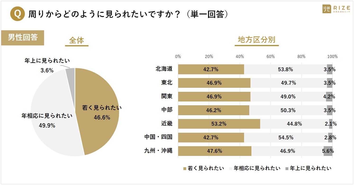 ・「年相応に見られたい」と回答、女性は全体の3割(30.5%)に対して、男性は半数(49.9%)が望む