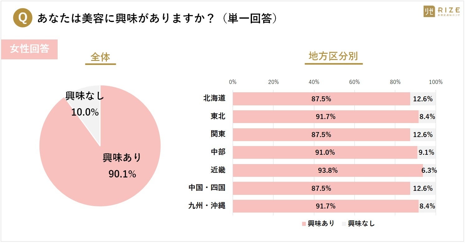 ・【女性:「美容」に興味ある地域は?】1位「近畿(93.8%)」、2位「東北」「九州・沖縄」(同率91.7%)