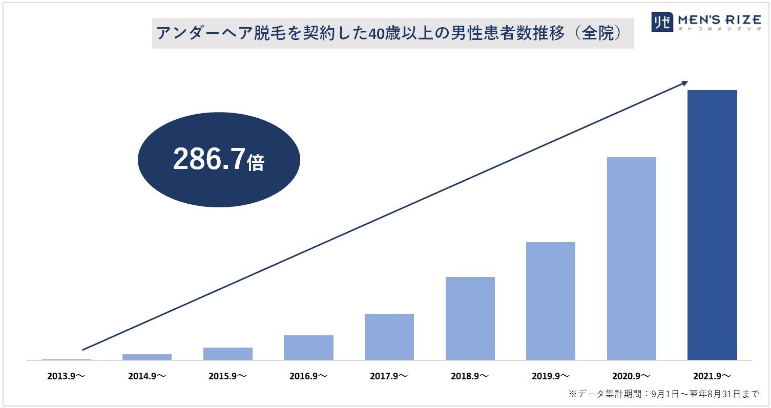 ▼40歳以上の男性患者数推移: 開院年(2013年)から9年間で286.7倍増