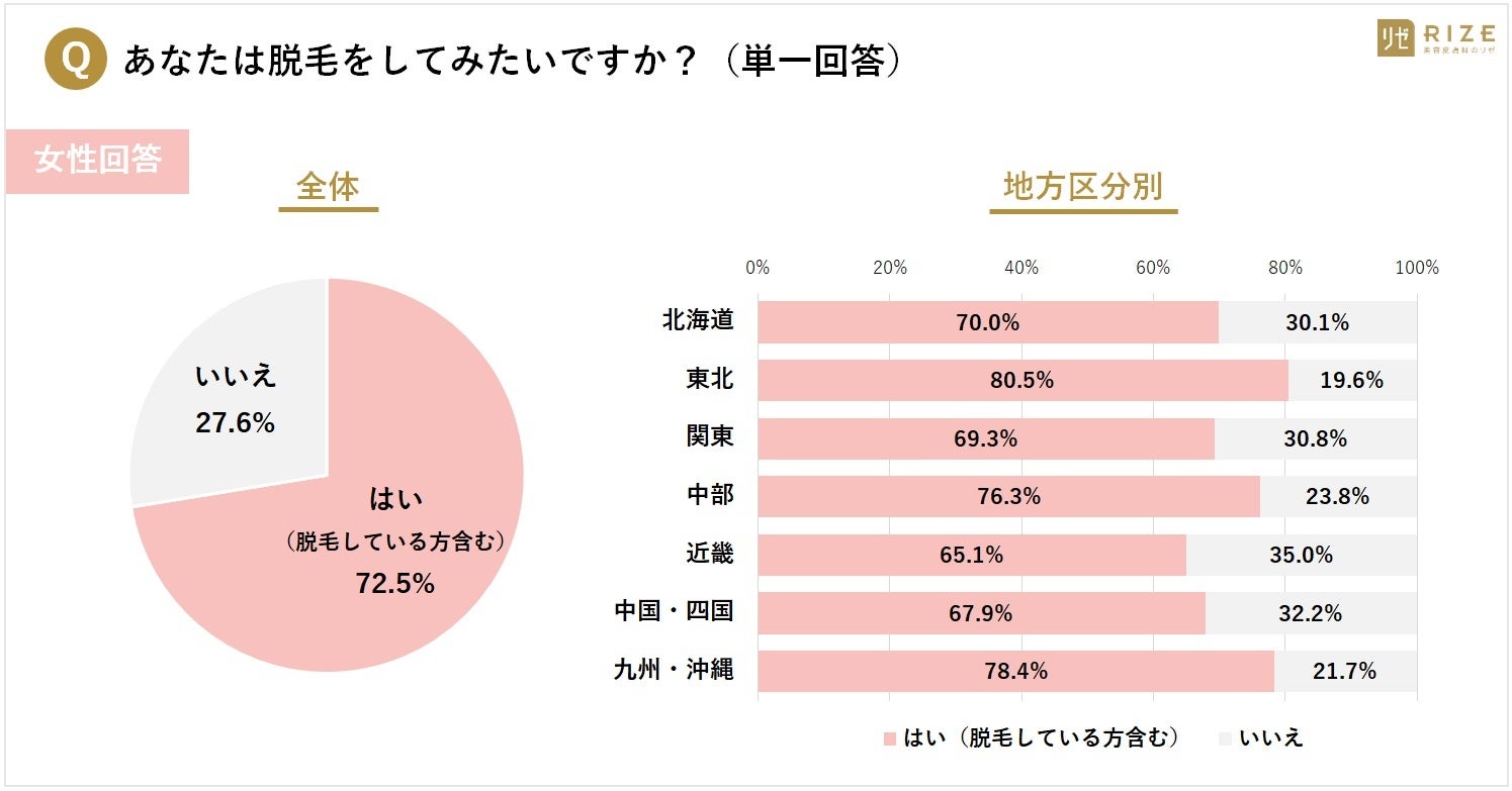 ・【女性:「脱毛したい」と回答の地域は?】1位「東北(80.5%)」、2位「九州・沖縄(78.4%)」