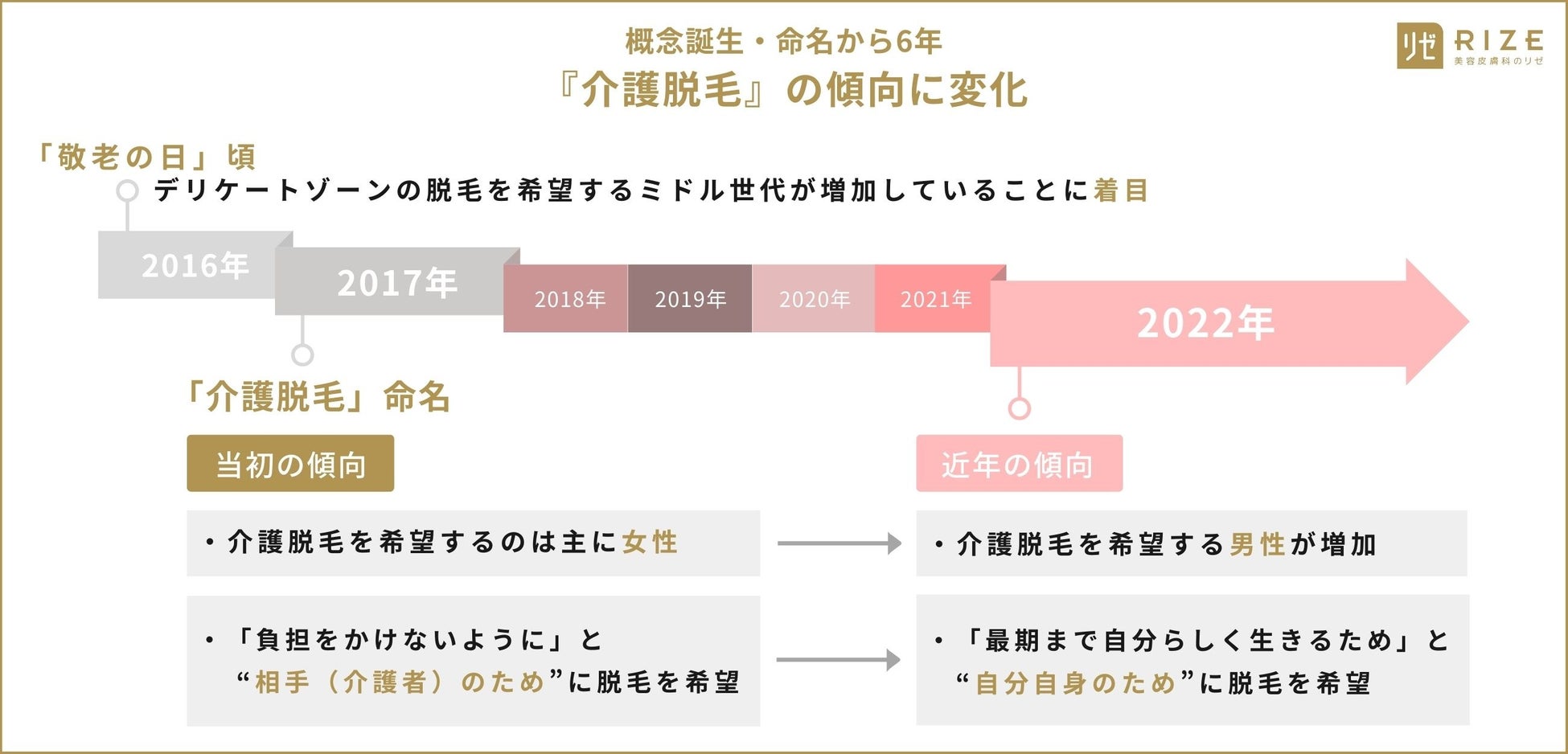 『介護脱毛』の誕生からまもなく7年目を迎えようとしている今、中高年世代が「介護脱毛をする理由」に「他人のため」から「自分のため」へと変化しつつあるとリゼクリニックでは感じています。