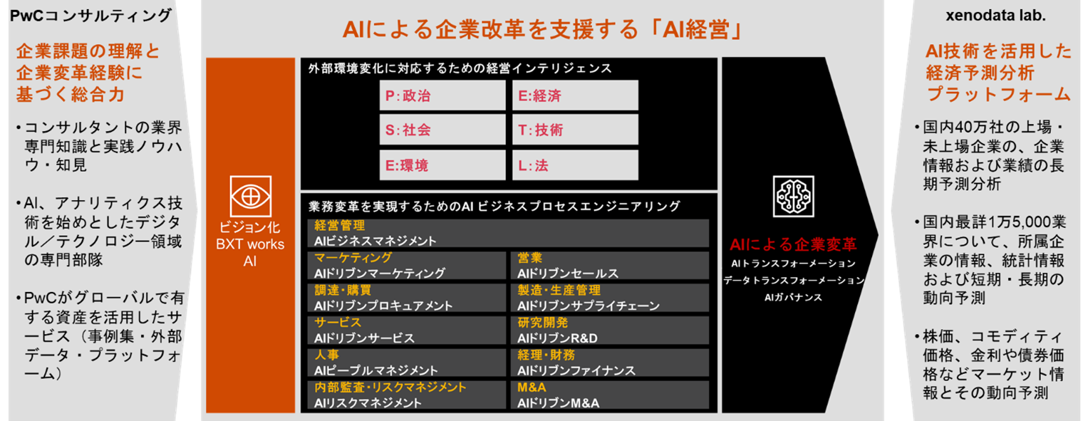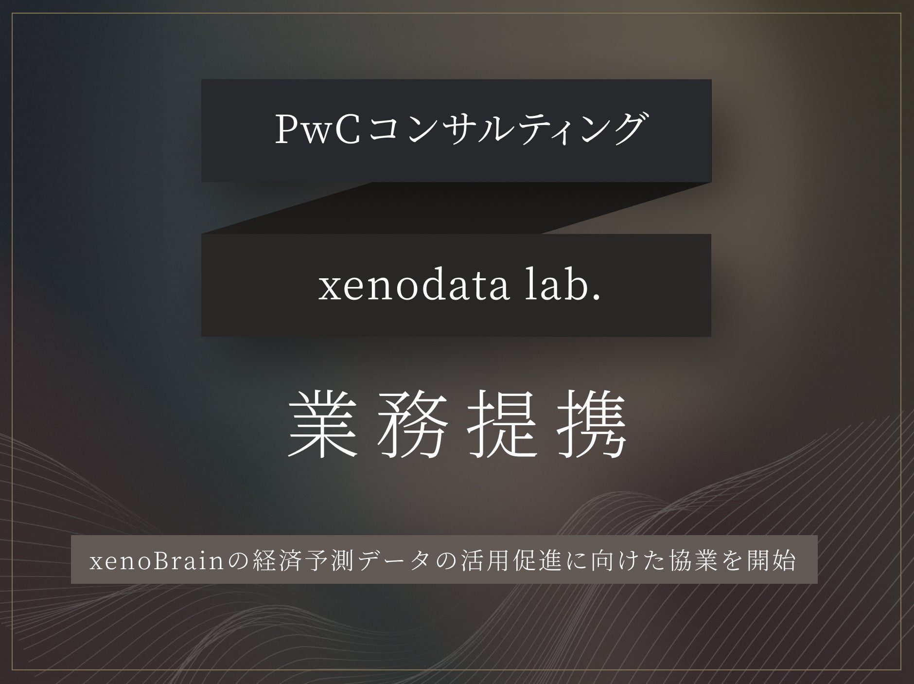 経済予測専門のクラウドサービス「xenoBrain(ゼノブレイン)」を提供する株式会社xenodata lab.(本社:東京都渋谷区、代表取締役:関洋二郎、以下「ゼノデータ・ラボ」)と、PwCコンサルティング合同会社(東京都千代田区、代表執行役CEO:大竹 伸明、以下「PwCコンサルティング」)は、クライアントが外部データから得られた経営インテリジェンスを活用し、より高度かつ迅速な経営層の意思決定を実現できるよう、本日よりxenoBrainの経済予測データの活用促進に向けた協業を開始します。