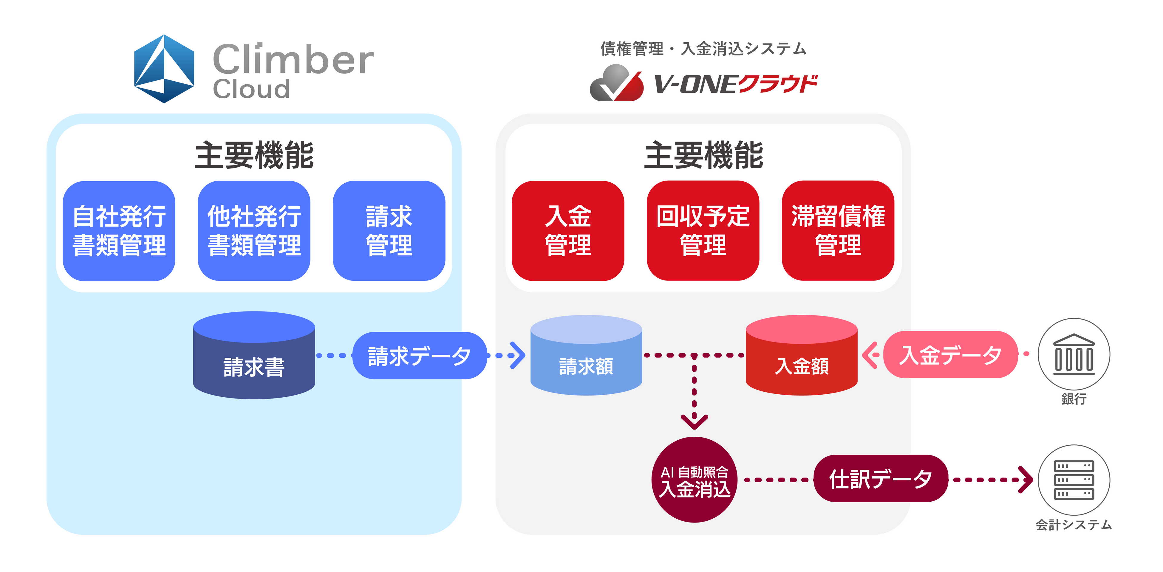 インボイス制度・電子帳簿保存法に対応したバックオフィス業務改革を支援するクラウドサービス「ClimberCloud」から、債権管理・入金消込システム「V-ONEクラウド」に請求書データをAPIで取り込むことが可能になりました。