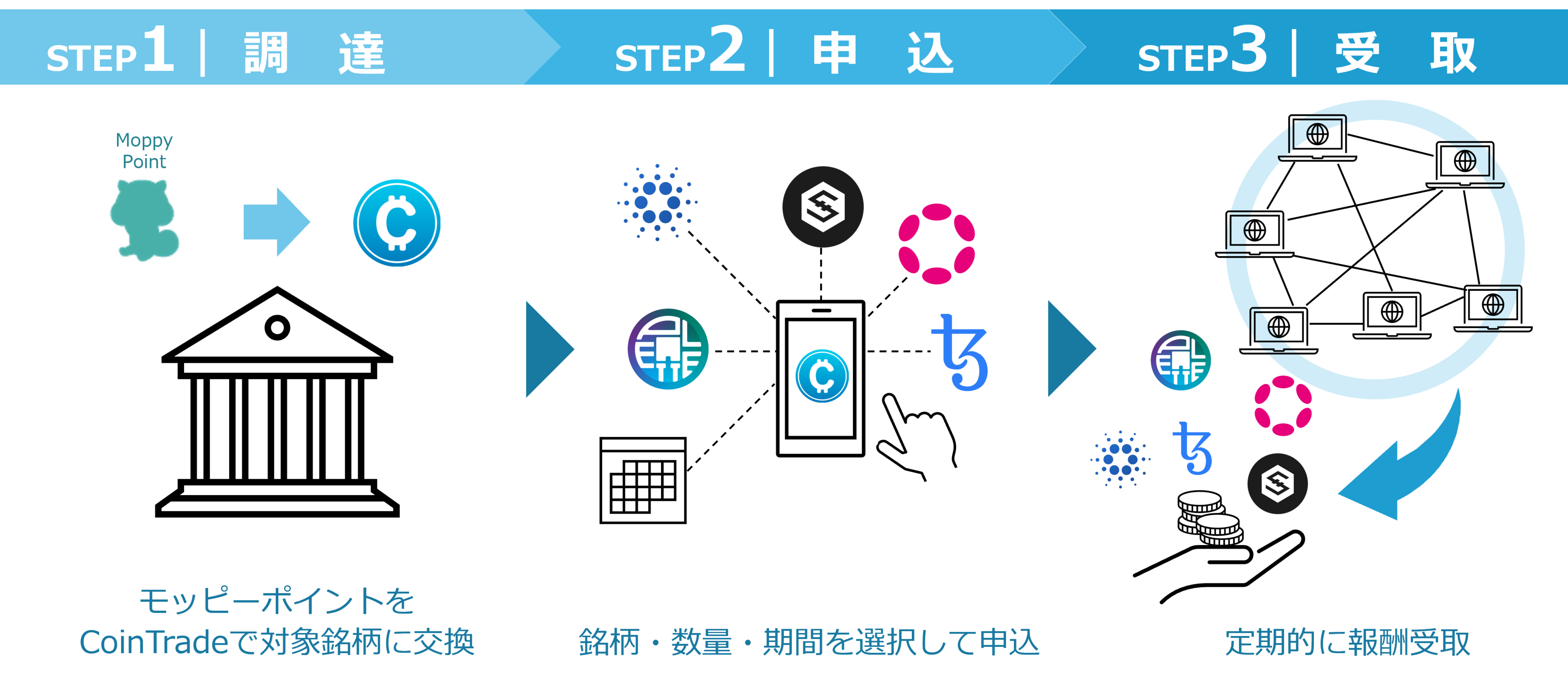 今回、暗号資産を一定期間保有することで報酬が得られるステーキングサービス「CoinTradeStake(コイントレードステーク)」とのポイント交換により、モッピー会員様の利便性向上を図るとともに、ポイント交換から資産運用が可能となり、暗号資産の利用率拡大が期待できます。