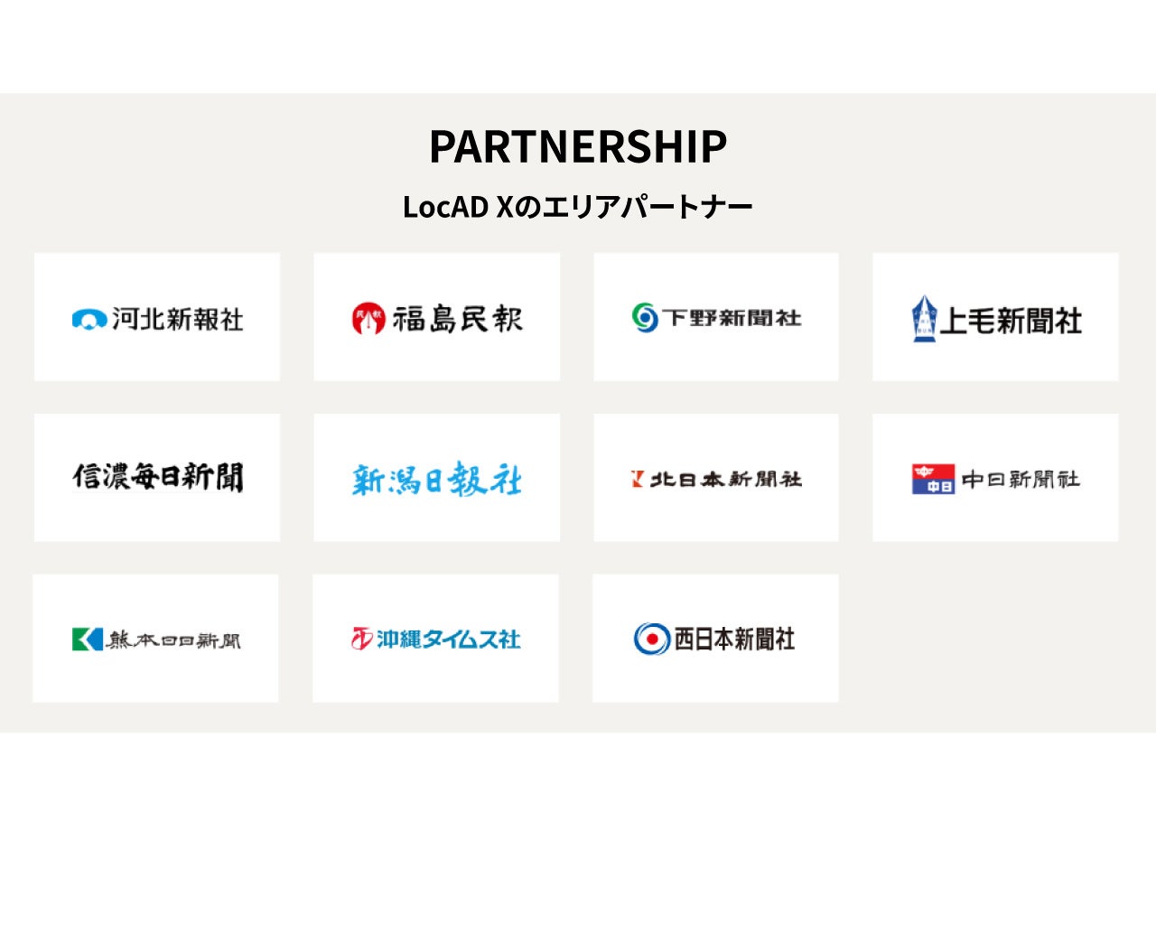 LocAD Xは、地方の企業様へデジタルを起点とした新しい価値を提供するため、東北・関東・中部・北陸・中国・九州の各地域で豊富な情報網を持つ地方新聞社11紙や代理店様とパートナーシップを締結して、サービスを提供しております。今後も、各エリアパートナーと連携し、各エリアに特化した精度の高い興味関心カテゴリーを作成するなど、さらなるLocAD Xのサービス充実を図っていきます。