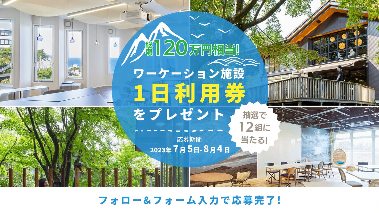 今回の「WORK×ation Site」予約・利用開始を記念して、抽選で12組に総額120万円相当の「WORK×ation Site」施設1日利用券が当たるキャンペーンを開催いたします。