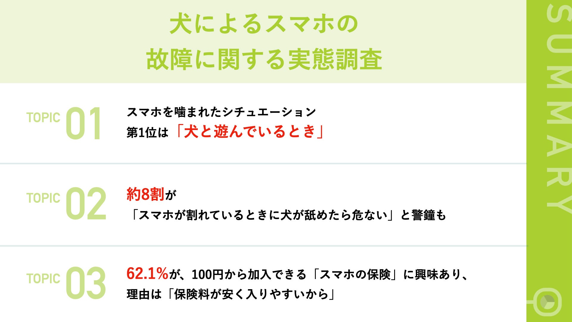 今回の調査では飼っている犬とスマホの関係がわかる結果となりました。犬がスマホをおもちゃのように扱ってしまい、噛まれてしまったり、割れた画面を舐めてしまい怪我をするリスクもある一方で、飼い主側にも愛犬の写真を撮ろうとスマホを落としてしまうケースもあり、犬を飼っている人にとって、スマホの故障がつきものであることが明らかとなりました。また、愛犬を見守りたいとお留守番カメラを設置している飼い主も多く、愛犬への愛情を感じ取れる調査結果となりました。これからも楽しい愛犬ライフを過ごすためにも、スマホが犬に噛まれても補償対象となる、100円から入れるスマホの保険を検討してみてはいかがでしょうか。
