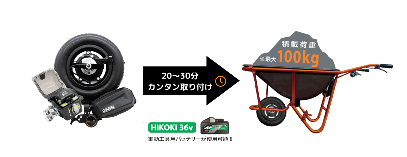 通常の手押し一輪車に後付けで電動化ができるタイヤキットです。