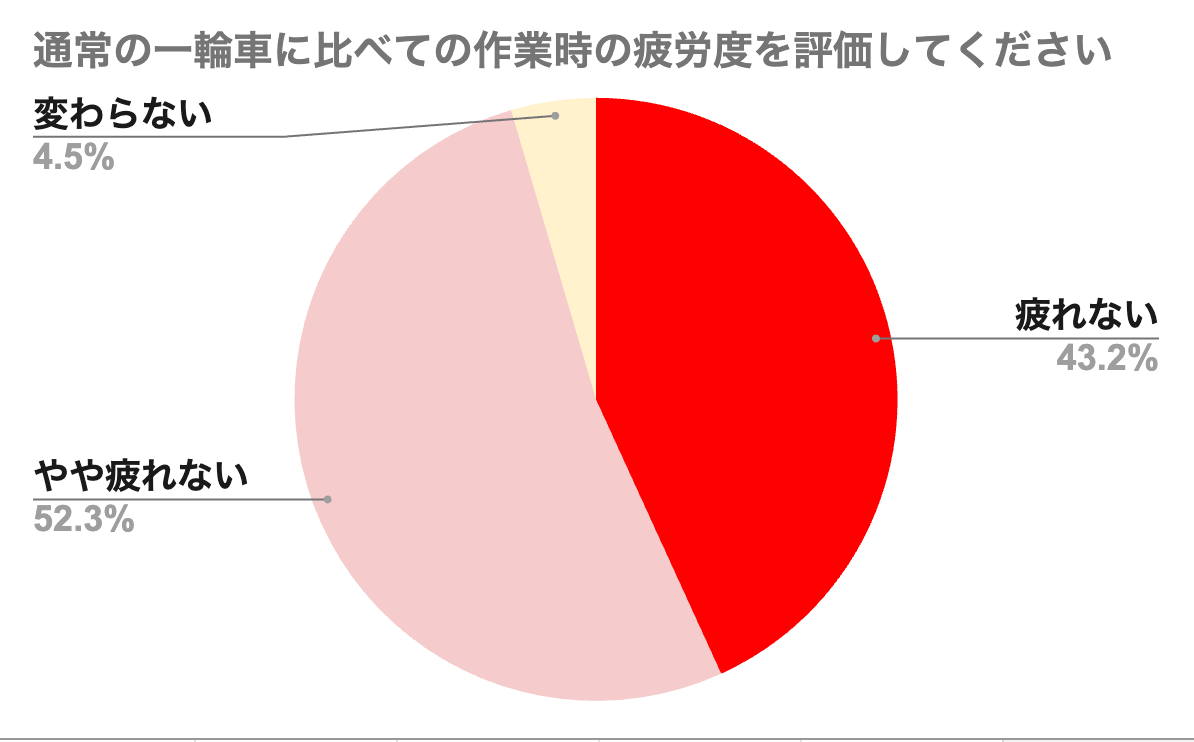 使用後のアンケートの「通常の一輪車と比べての作業時の疲労度」という設問に、全体の95%が「通常の一輪車に比べて疲れない」と回答しました。(回答数44件)