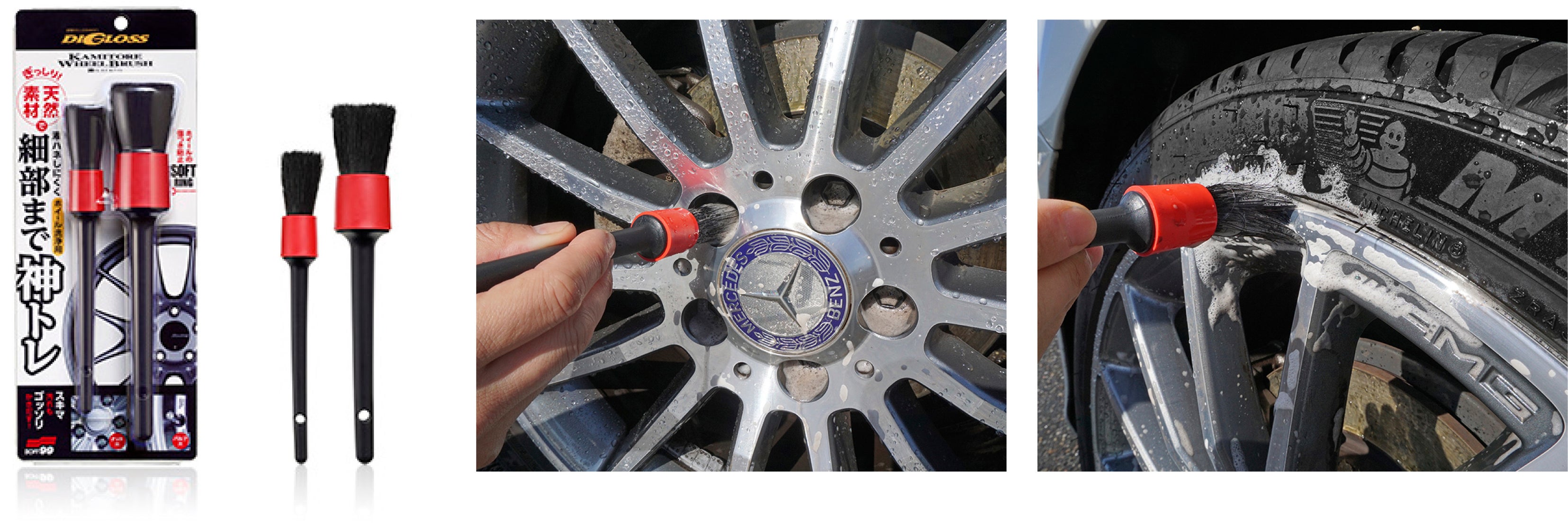 ホイールのナット穴やバルブ穴周辺などの細部の汚れまで残さずかき取る、ホイールクリーニング専用ブラシ。適度なコシのある天然豚毛100%素材が、従来の洗浄用スポンジでは届かない隙間の汚れもしっかりかき出します。