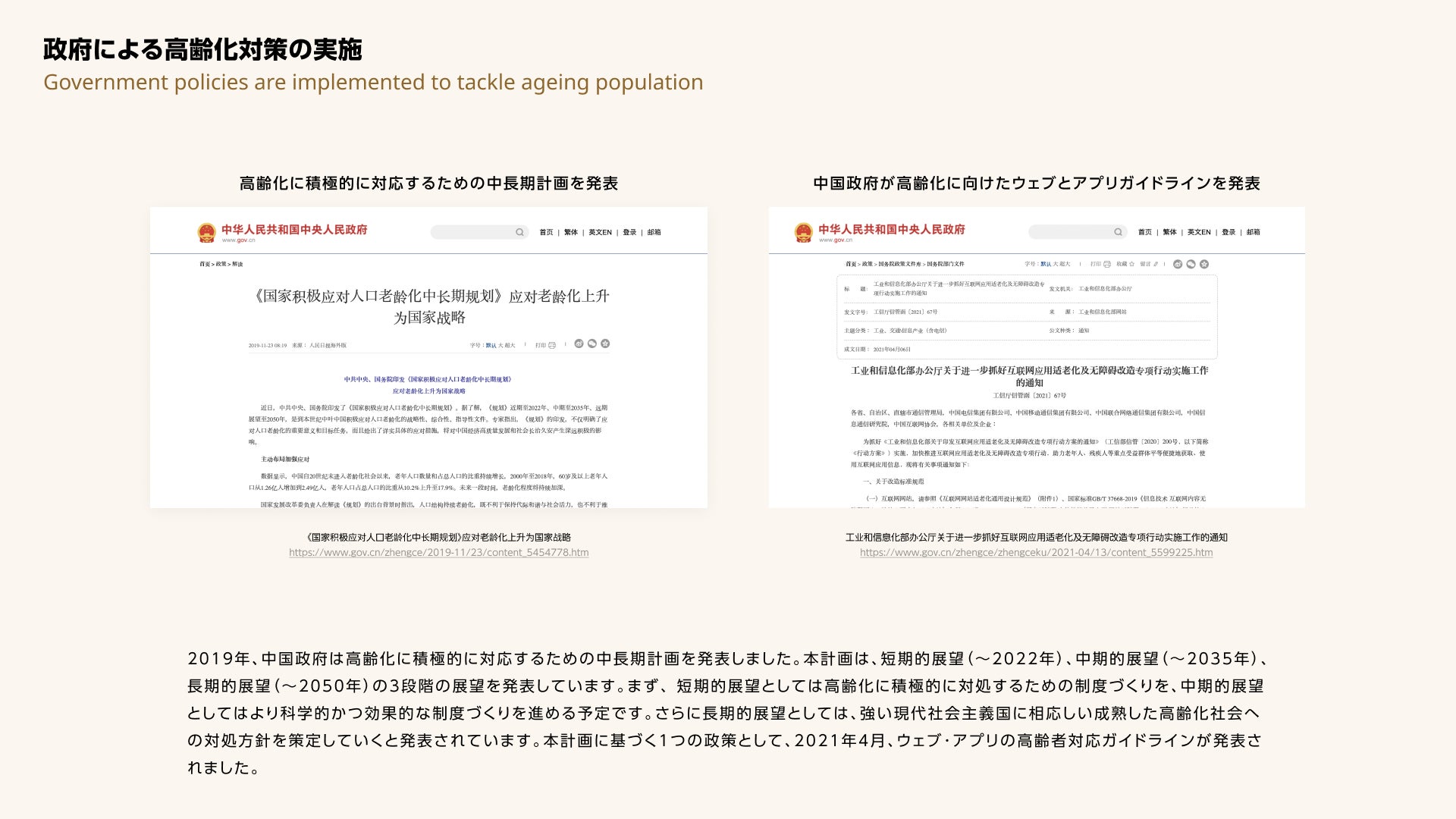 2019年、中国政府は高齢化に積極的に対応するための中長期計画を発表しました。本計画は、短期的展望(〜2022年)、中期的展望(〜2035年)、長期的展望(〜2050年)の3段階の展望を発表しています。まず、 短期的展望としては高齢化に積極的に対処するための制度づくりを、中期的展望としてはより科学的かつ効果的な制度づくりを進める予定です。さらに長期的展望としては、強い現代社会主義国に相応しい成熟した高齢化社会への対処方針を策定していくと発表されています。本計画に基づく1つの政策として、2021年4月、ウェブ・アプリの高齢者対応ガイドラインが発表されました。