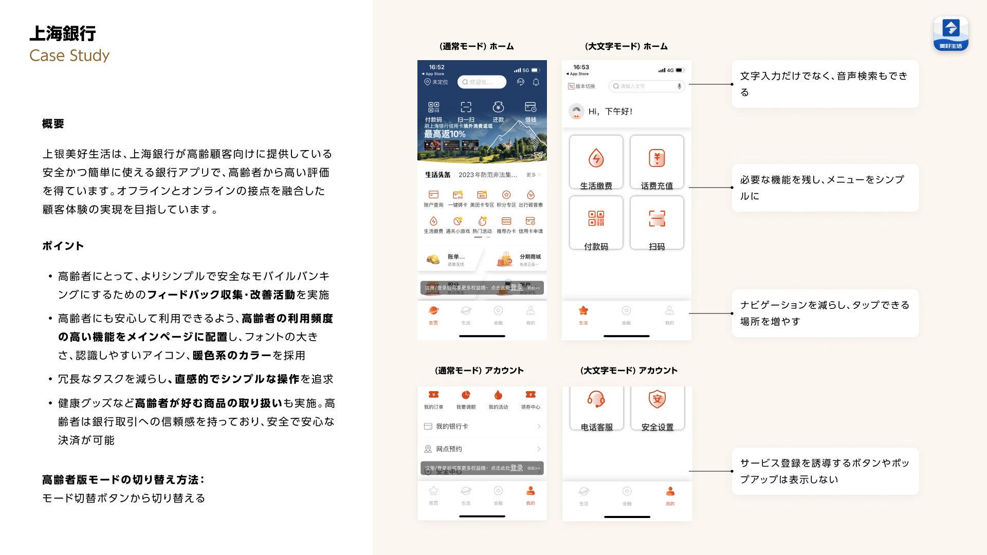 上海銀行が高齢顧客向けに提供している安全かつ簡単に使える銀行アプリの上海美好生活は高齢者から高い評価を得ています。オフラインとオンラインの接点を融合した顧客体験の実現を目指し、高齢者にとって、よりシンプルで安全なモバイルバンキングにするためのフィードバック収集・改善活動を実施しています。高齢者にも安心して利用できるよう、高齢者の利用頻度の高い機能をメインページに配置し、フォントの大きさ、認識しやすいアイコン、暖色系のカラーを採用しています。