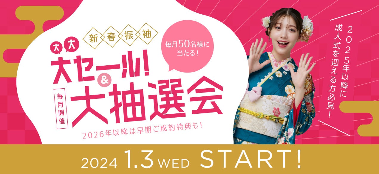 2025年以降に成人式を迎える方必見!買っても借りてもお得なプランが目白押し 京都きもの友禅 新春振袖 大大大セール&大抽選会 2024年1月3日(水)より開催