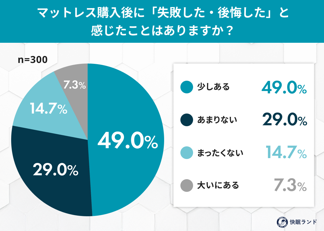 高額かつ長期間使用する寝具である「マットレス」。毎日使うものだからこそ慎重に選びたい一方で、「思っていた寝心地と違った」「もっと確認しておけばよかった」と、購入後に後悔する声も少なくありません。快眠グッズ紹介サイト「快眠ランド」を運営するムーンムーン株式会社は、過去5年以内にマットレスを購入した全国の男女300名を対象に、「マットレス選びの後悔」に関する調査を実施しました。その結果、購入者の半数以上が何らかの後悔を感じている実態が明らかとなりました。