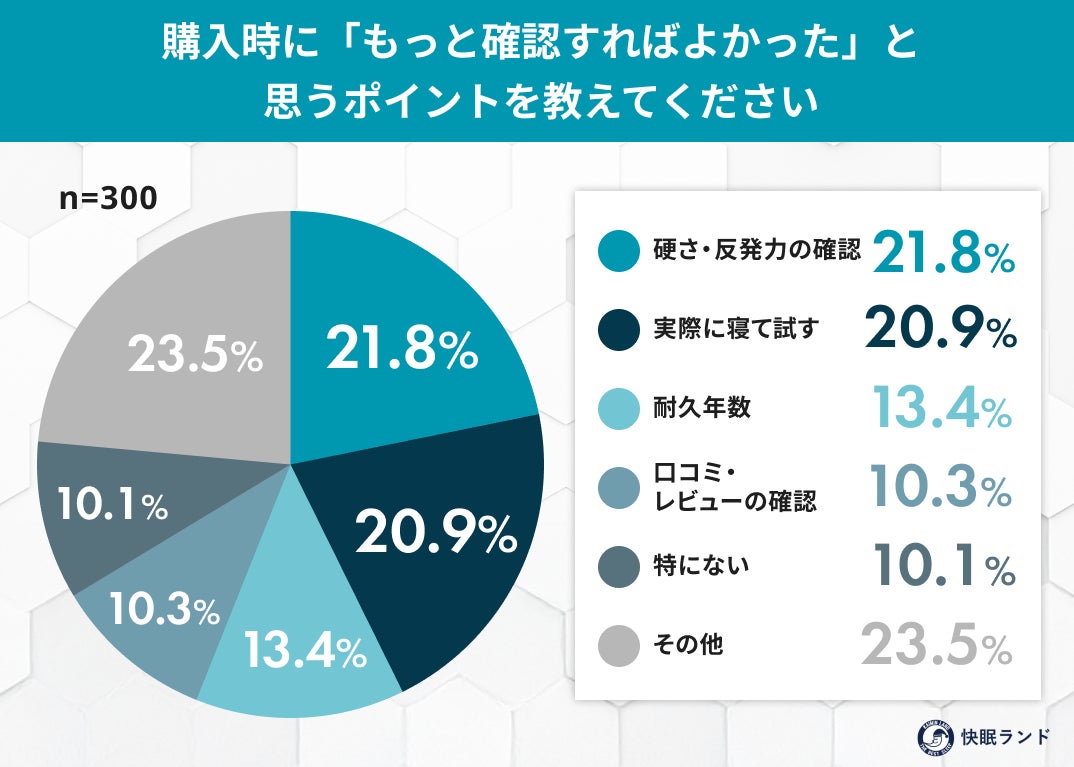 購入時に確認不足だった点は「硬さ・反発力」「実際に寝て試す」が上位