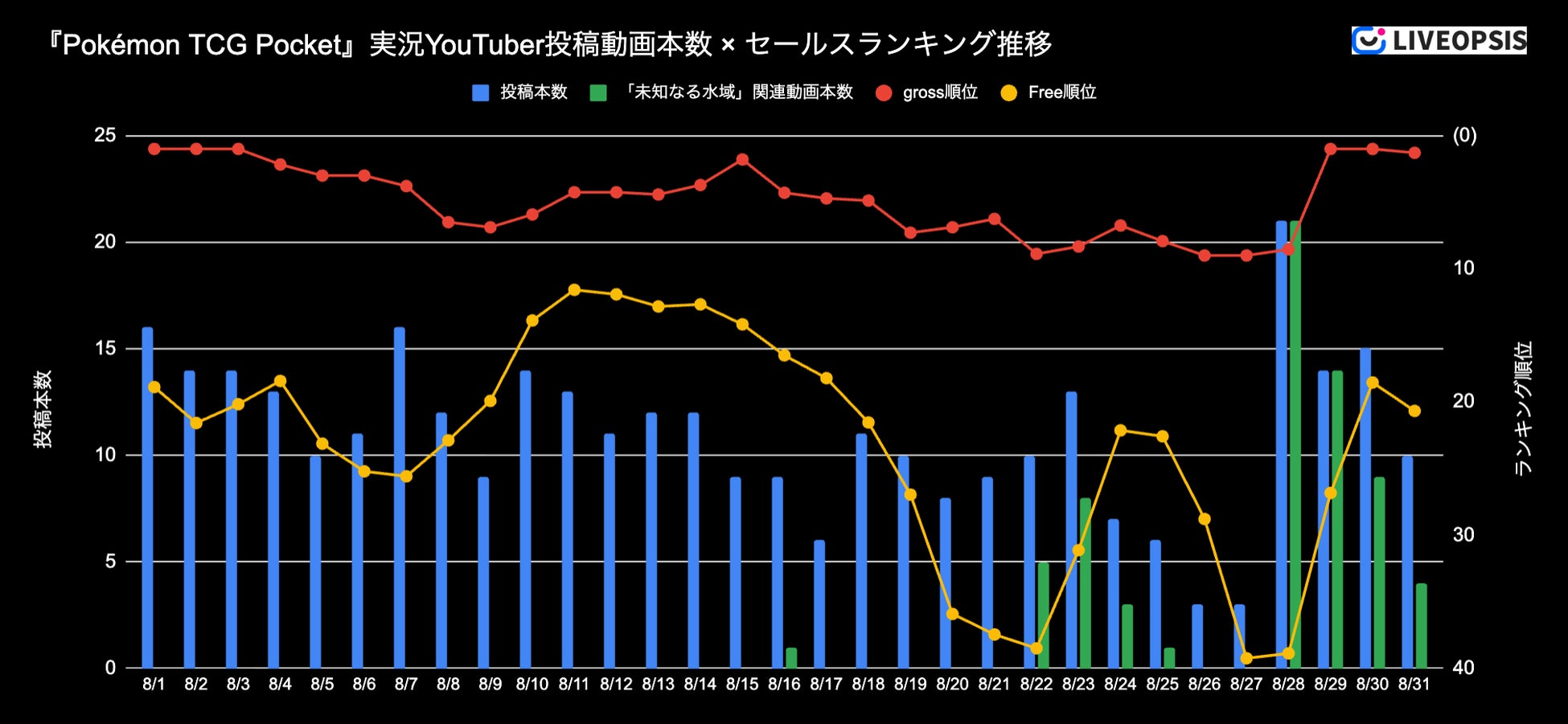 次いでランクインしたのは『Identity V』『Pokémon TCG Pocket』となり、先月から順位を大きく上げました。特に『Pokémon TCG Pocket』は先月から5つ順位を上げ、トップ3に急上昇しました。8月28日に実装された新拡張パック「未知なる水域」がきっかけとなり、投稿動画は月後半に集中。投稿本数は14本と微増にとどまりましたが、一方で再生数は前月比で1,000万回以上も増加しました。