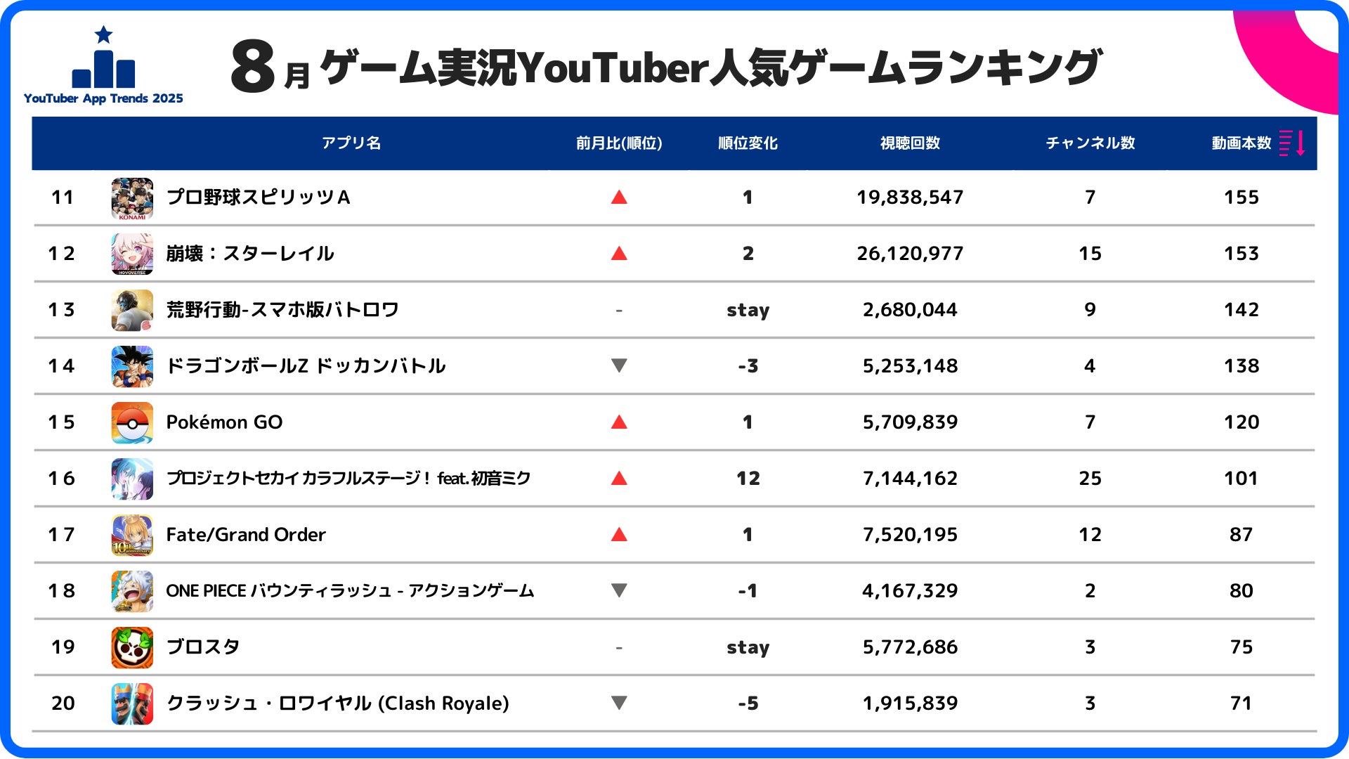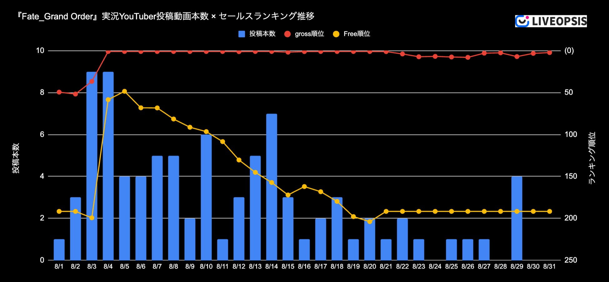『Fate/Grand Order』は、ランキング順位を1つ上げたものの、投稿本数やチャンネル数、再生数は大きな変化がなく安定した推移を示しました。その一方で、8月に10周年を迎えたことで19日間連続でApp Storeセールスランキング1位を記録するなど、市場において圧倒的な存在感を改めて示しました。
