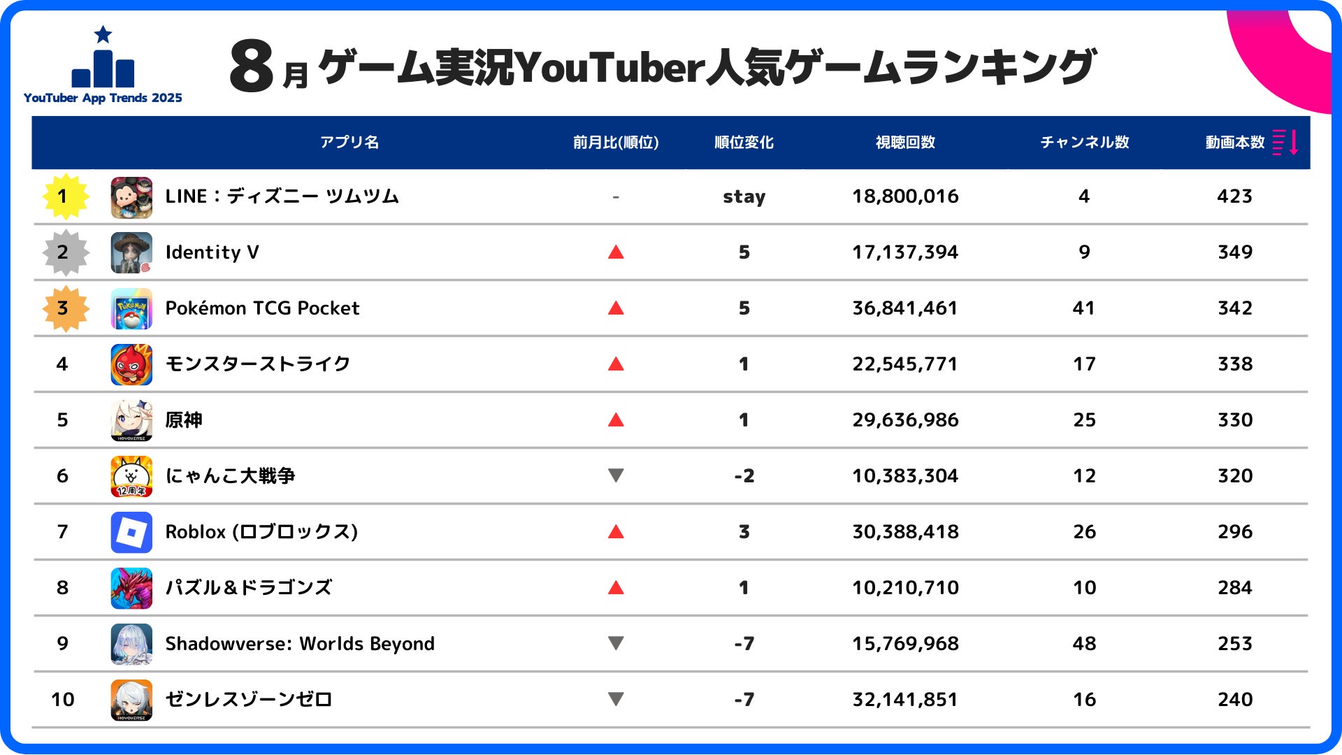 7月に続き『LINE:ディズニーツムツム』がランキング首位をキープしました。トップ3入りは2025年に入ってから通算5度目となり、実況者の間で半年以上にわたって高い人気を集め続けています。