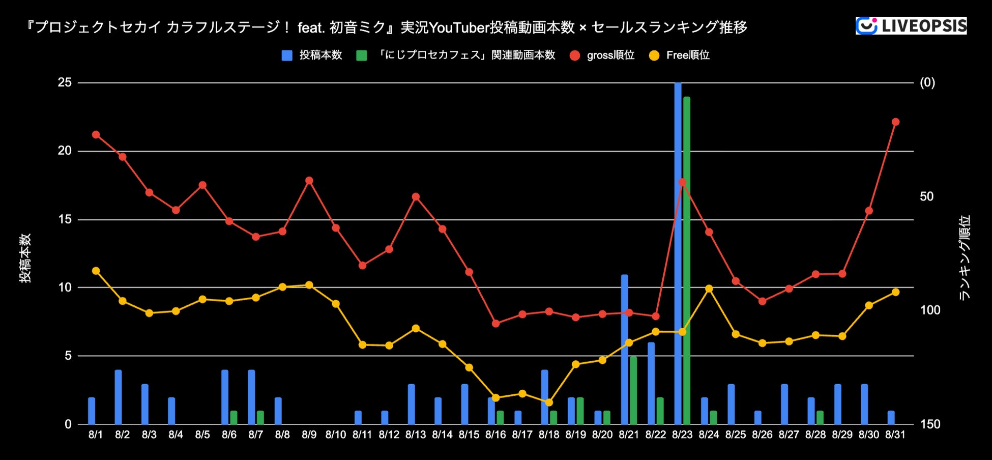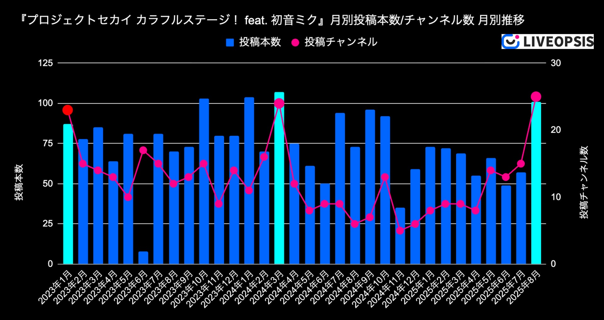 『プロジェクトセカイ カラフルステージ! feat. 初音ミク』は、にじさんじ所属Vtuber主催の公認イベント「にじさんじプロセカフェスティバル」の開催が契機となり、順位を大きく上げ16位にランクイン。投稿本数は先月比で52本増加し、参加チャンネル数も12チャンネル拡大しました。大会前後で投稿数に明らかな差が見られ、このイベントが露出量に大きく影響したことが確認できます。