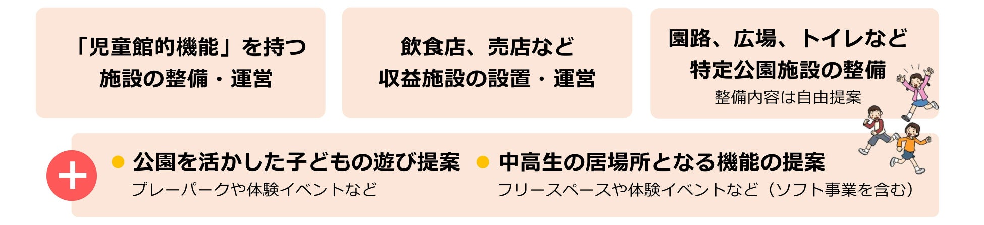 ・「収益施設」は新たなサービスを提供できる施設として、飲食店や売店などの公園利用者の利便性が向上するものの提案を期待。