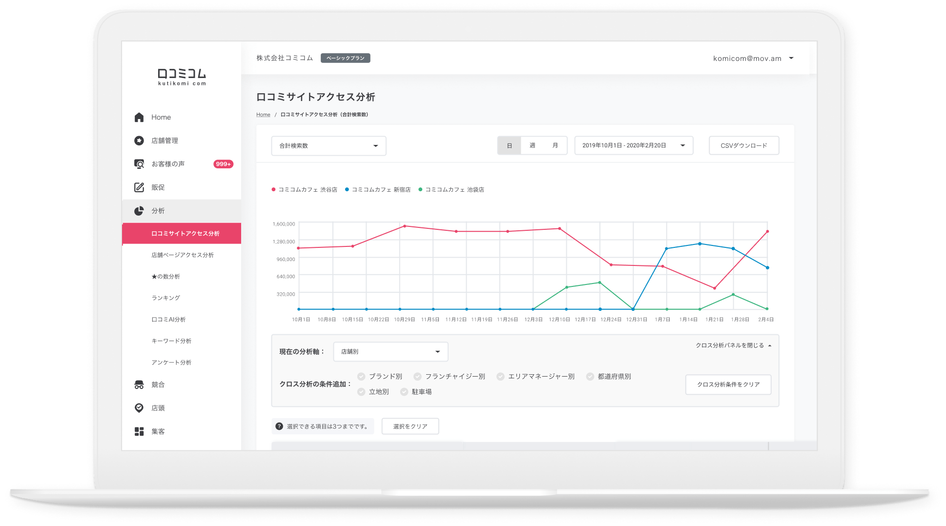 口コミコムは、Googleマップをはじめとした地図アプリや口コミサイトでの店舗情報を整理し一括更新できると同時に、口コミをAI解析して店舗の問題点を把握し業務改善に活かすことができる、お客様の声を業務改善に繋げられるDXサービスです。