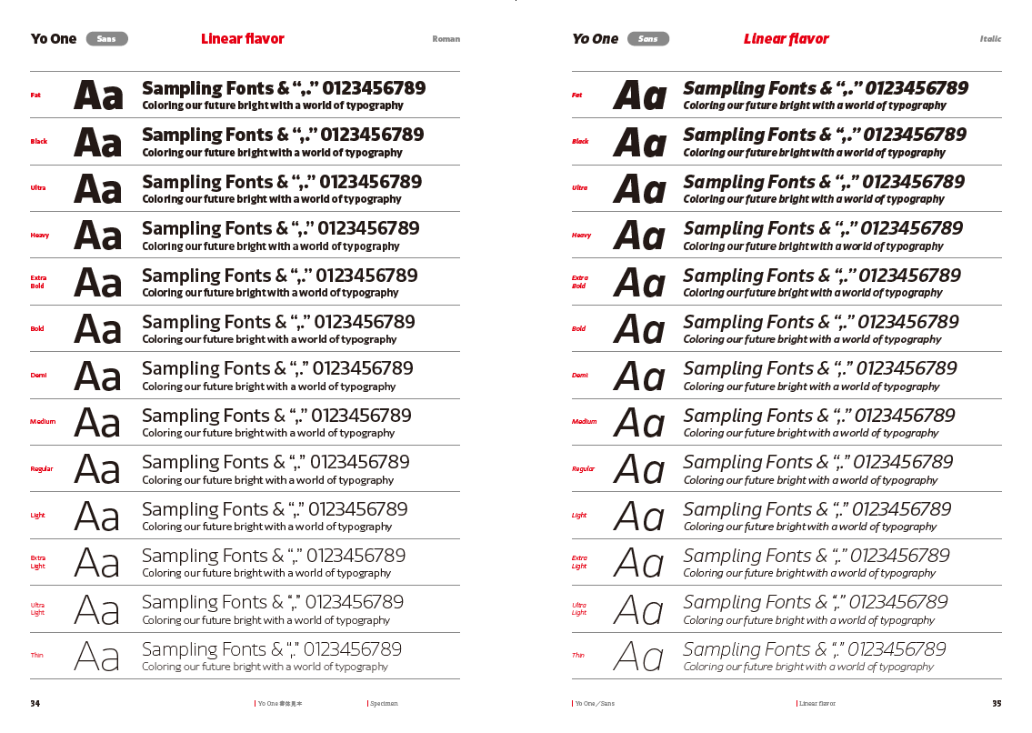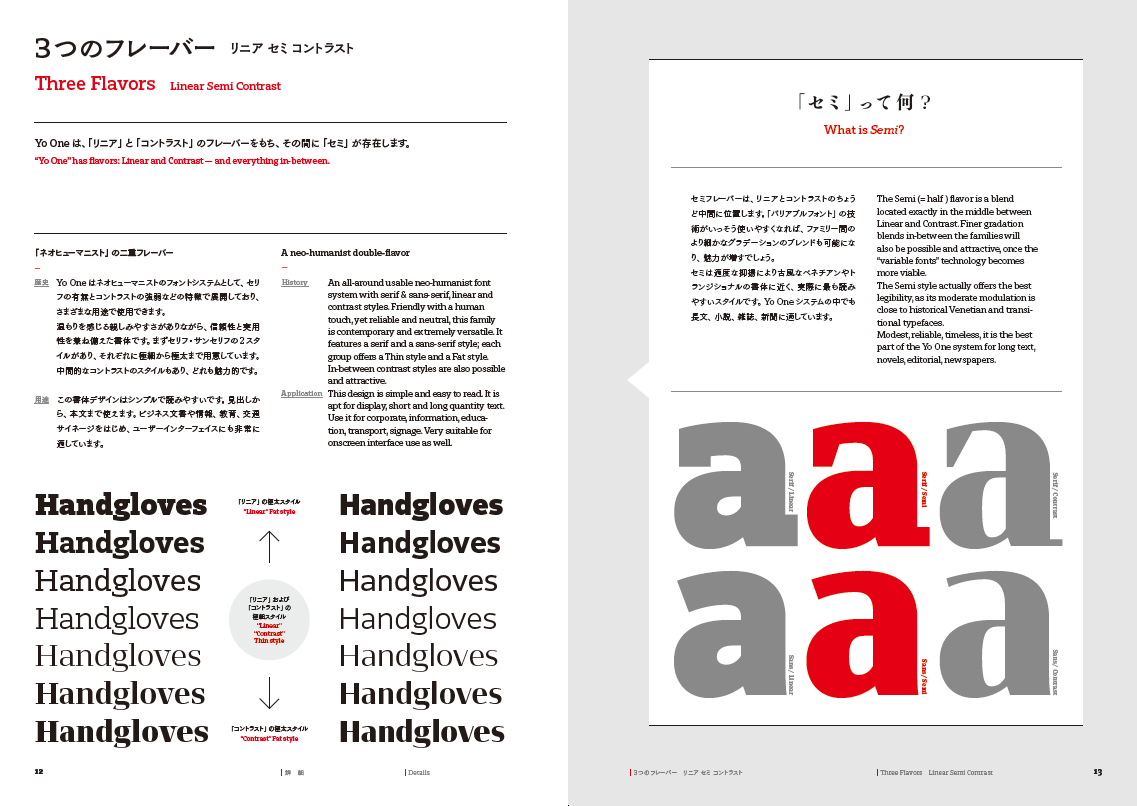 フォントワークスのデザイナーが手掛けた初のオリジナル欧文書体のリリースを記念し、Yo One 書体見本帖を作成しました。