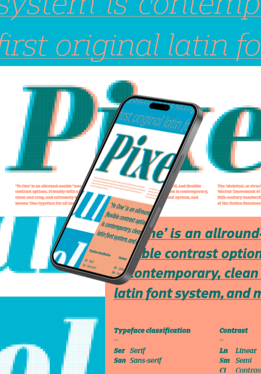 フォントワークス書体デザインディレクター ヨアヒム・ミュラー・ランセイが制作した欧文書体 Yo One は、欧文書体が持つさまざまなバリエーションを複数の軸で体系化したフォントシステムであり、156フォントを有するスーパーファミリーです。