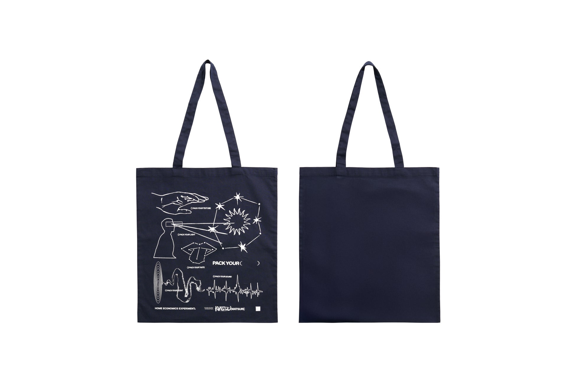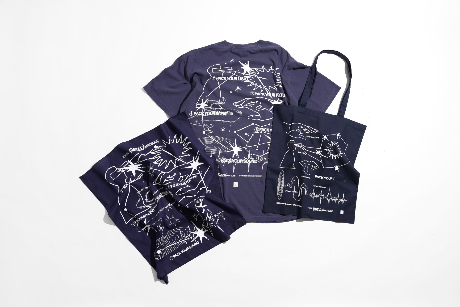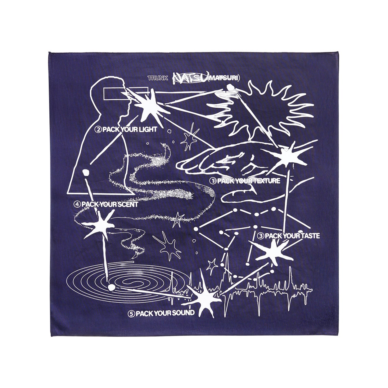 Tシャツは、ホワイト、ネイビー、グレーの3色展開で、フロントに「PACK YOUR ( )」のメッセージ、バックにはカラーごとに異なるデザインを配置。バンダナとトートバッグにも、五感を刺激するTRUNK NATSU MATSURI ’25のイベントコンセプトを“星空”に見立てて表現されています。