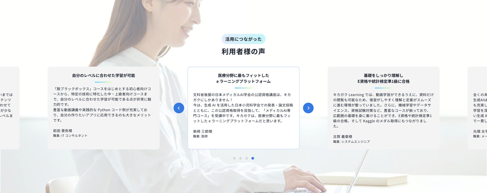 キカガクラーニングを通じて、多くの方々がスキルアップを実現し、キャリアの飛躍を遂げています。キカガクラーニングを利用し、活用につながった方の声を掲載しました。