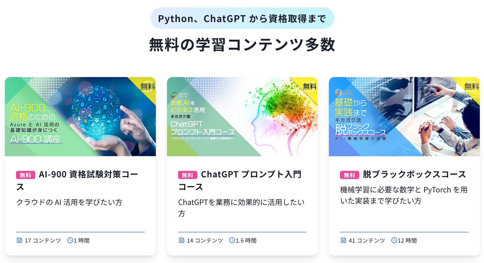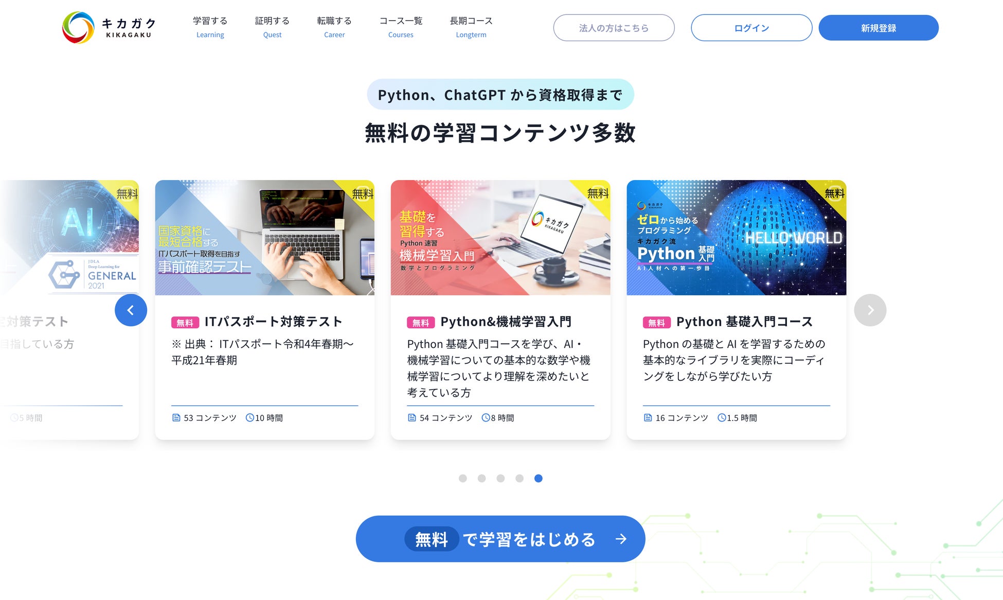キカガクラーニングで学べるPython・機械学習・生成 AI や資格取得の対策コースなど、キカガクラーニングが提供しているコースがわかりやすくなりました。