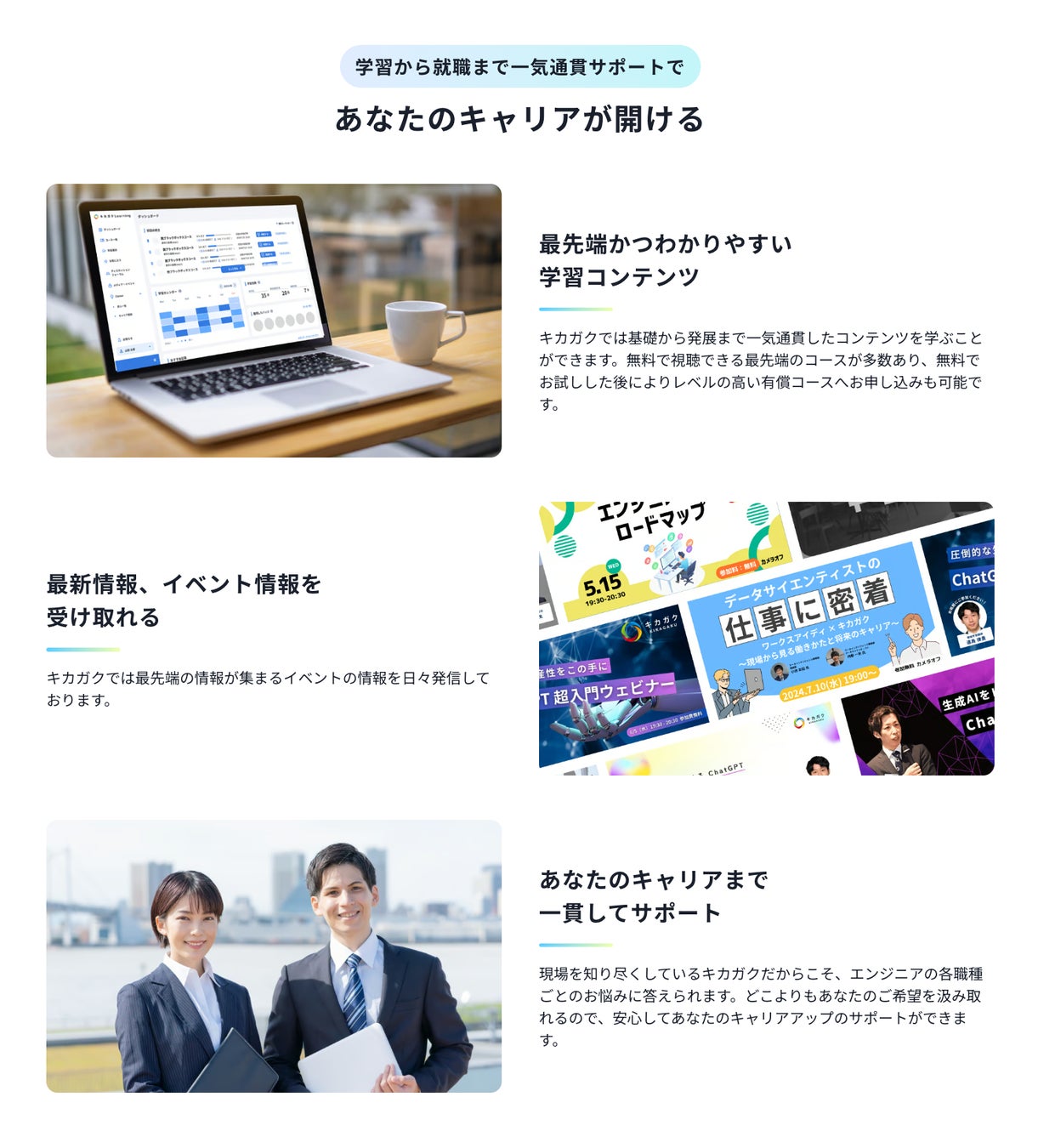 学習からキャリアまでの一貫したサポートを強調
