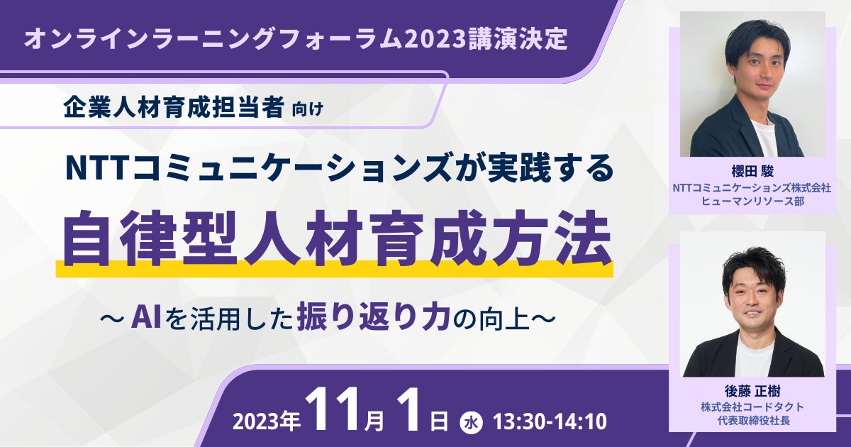 人・組織の成長支援プラットフォーム「チームタクト」を運営するコードタクトと、NTTコミュニケーションズが、オンライン教育・研修の総合イベント「オンラインラーニングフォーラム2023」で講演