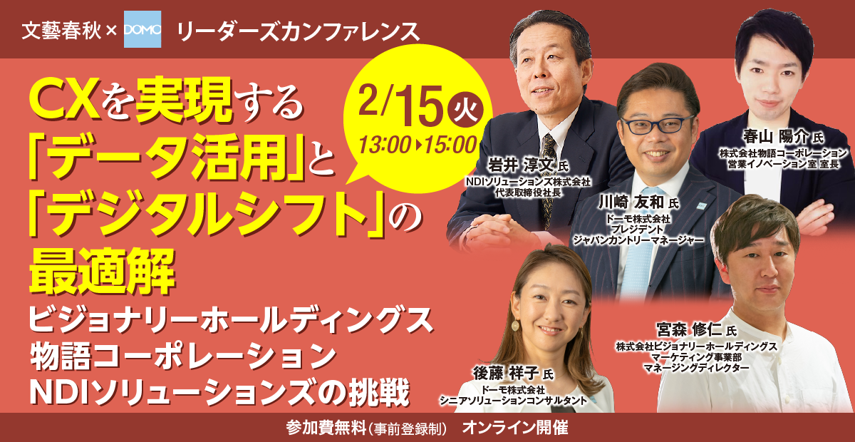 ドーモ株式会社は、2月15日(火)に文藝春秋リーダーズカンファレンス『CXを実現する「データ活用」と「デジタルシフト」の最適解~ビジョナリーホールディングス、物語コーポレーション、NDIソリューションズの挑戦』に協賛します。中小企業がいかにデータを活用し、ビジネス成長を実現しているか、先行き不透明な現在、取り組むべき企業変革について深堀します。