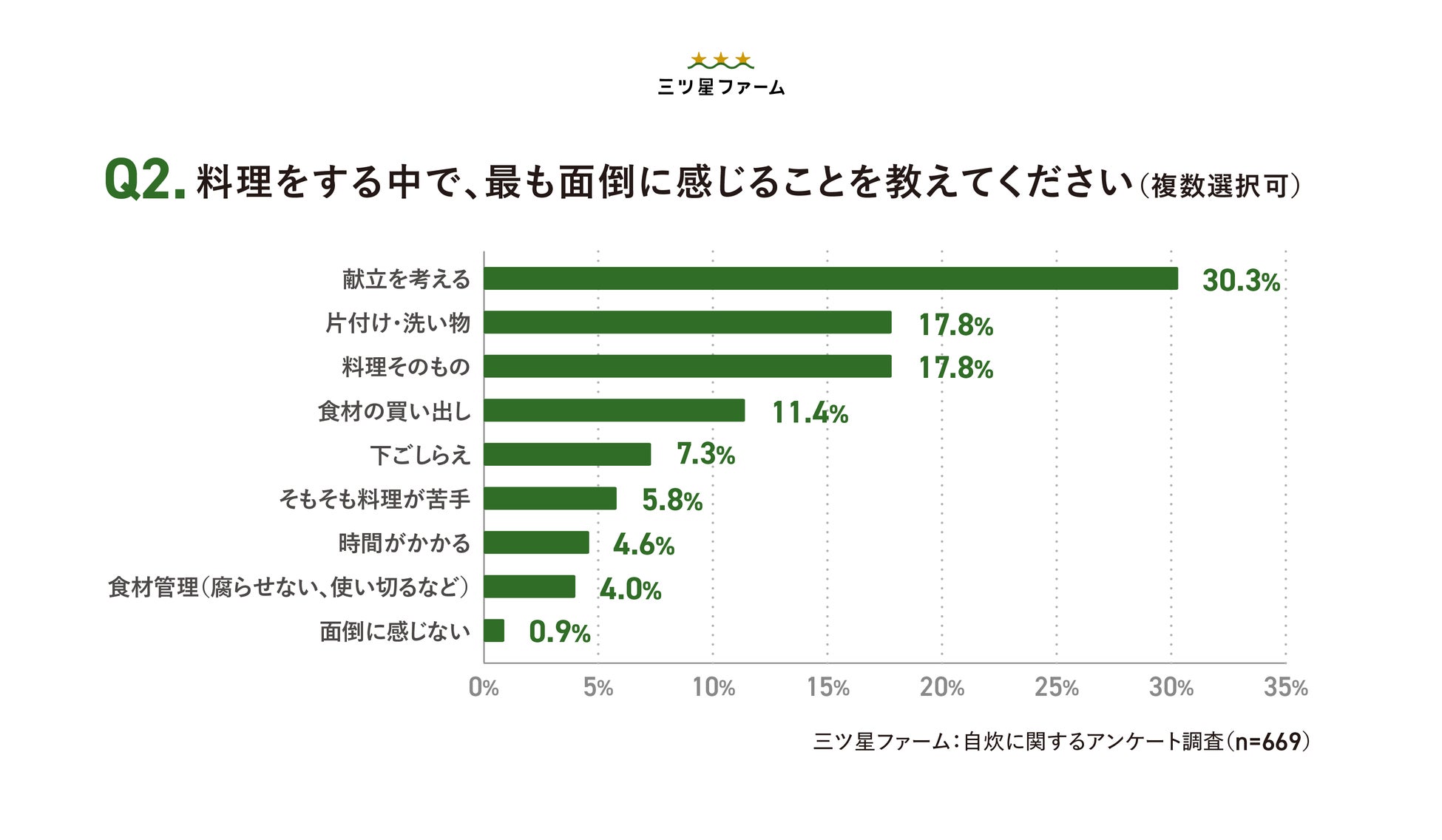 ・自炊をするうえで面倒に感じることは「献立を考える」が最多で30.3%。次いで「片付け・洗い物」(17.8%)「料理そのもの」(17.8%)、「食材の買い出し」(11.4%)と続く