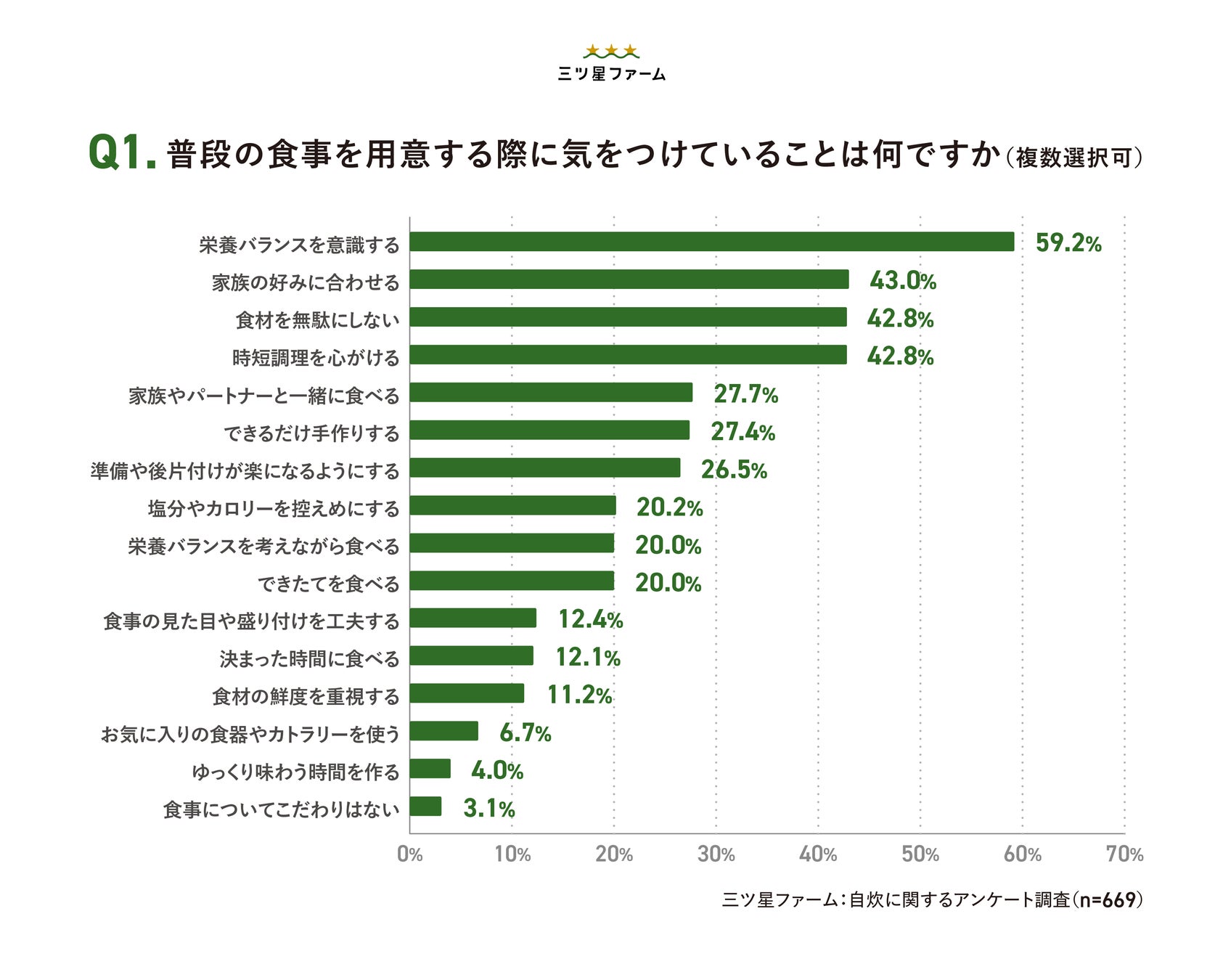 三ツ星ファームは、「毎日のごはんに感動を。」をコンセプトとした冷凍おかずの定期便サービスです。お客様一人ひとりの食事の時間が「おいしさを楽しむ時間」「家族との会話を楽しむ時間」「ホッと一息つく時間」など人生に彩を添える時間になってほしいという想いを込めてサービスを提供しています。この度、設立50周年を迎える、3月8日の 「国際女性デー」 に際し、仕事に家庭に忙しい日々を送る20~50代の「ワーママ」(働くママ)の「日々の料理」についての現状を明らかにし、課題解決の一助とするべく「働くママ669人に聞いた “自炊のリアル” 」と題する調査を実施いたしました。