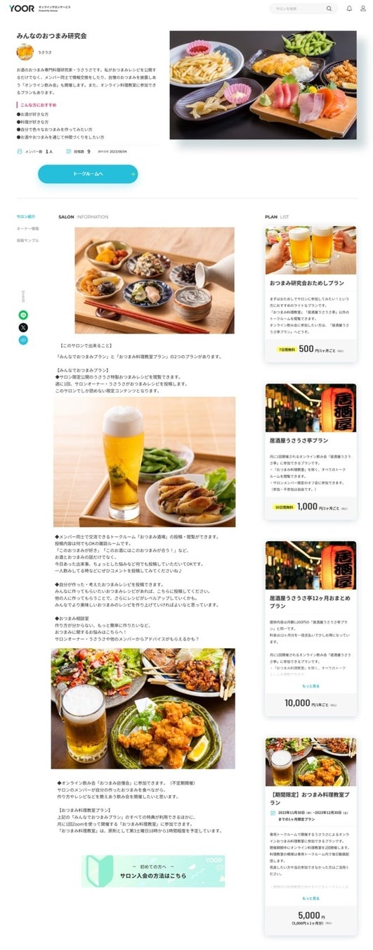 YOORは、誰でも自由にオンラインサロンを開設できるサービスです。趣味のコミュニティやファンクラブ、オンラインレッスンの場として様々なオーナーがサロンを主宰しています。サロンのメンバーは、価値観が同じ仲間と交流を深める、新しい知識を学ぶなど、新しい体験が可能です。