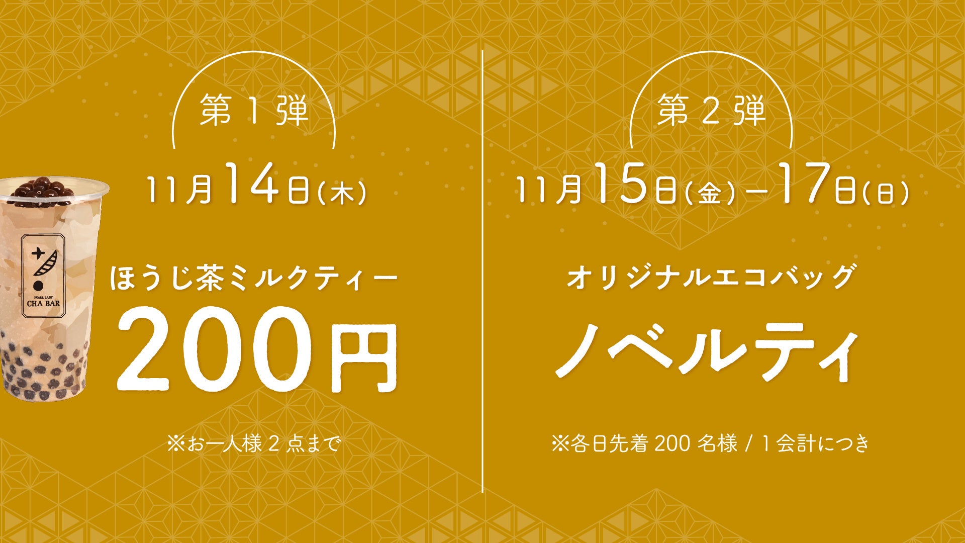 オープンを記念し11月14日(木)限定で、1番人気の「ほうじ茶ミルクティー(通常価格460円)」を1杯200円でご提供致します。