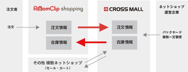 このたびの連携により、「RoomClip ショッピング」に出店されている複数ネットショップ展開企業さまは、「CROSS MALL」が管理している注文情報を反映することで、随時更新されている在庫数を「RoomClip ショッ