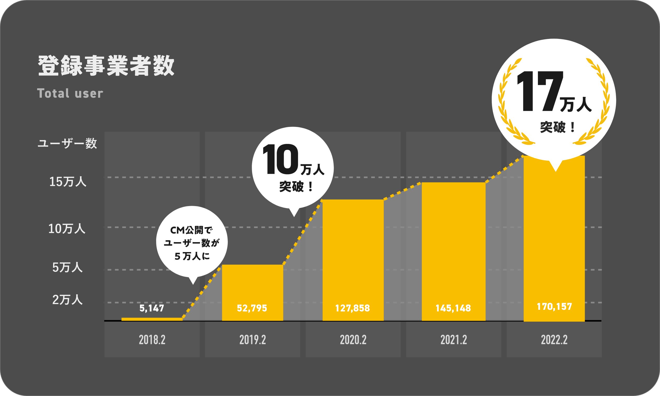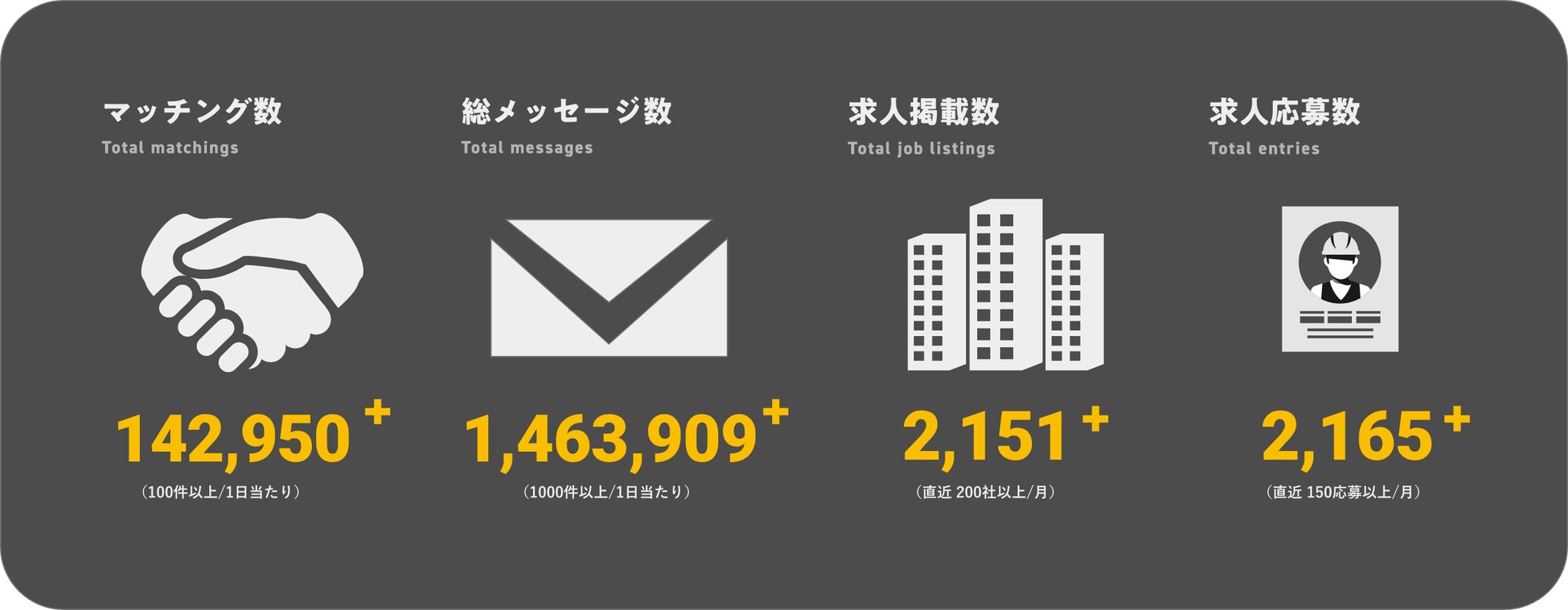 当社は2017年3月の創業以来「建設現場を魅力ある職場に。」というミッションをかかげて、建設現場で働く職人さんや工事会社様向けにマッチング・採用サービスを中心としたサービスを展開し、建設業の人手不足の解消に向けて尽力をしてまいりました。現在17万超の事業者にご利用いただいており、新たな協力会社・取引先探し及び、社員採用に活用いただき、事業の拡大や成長のサポートをさせていただいています。