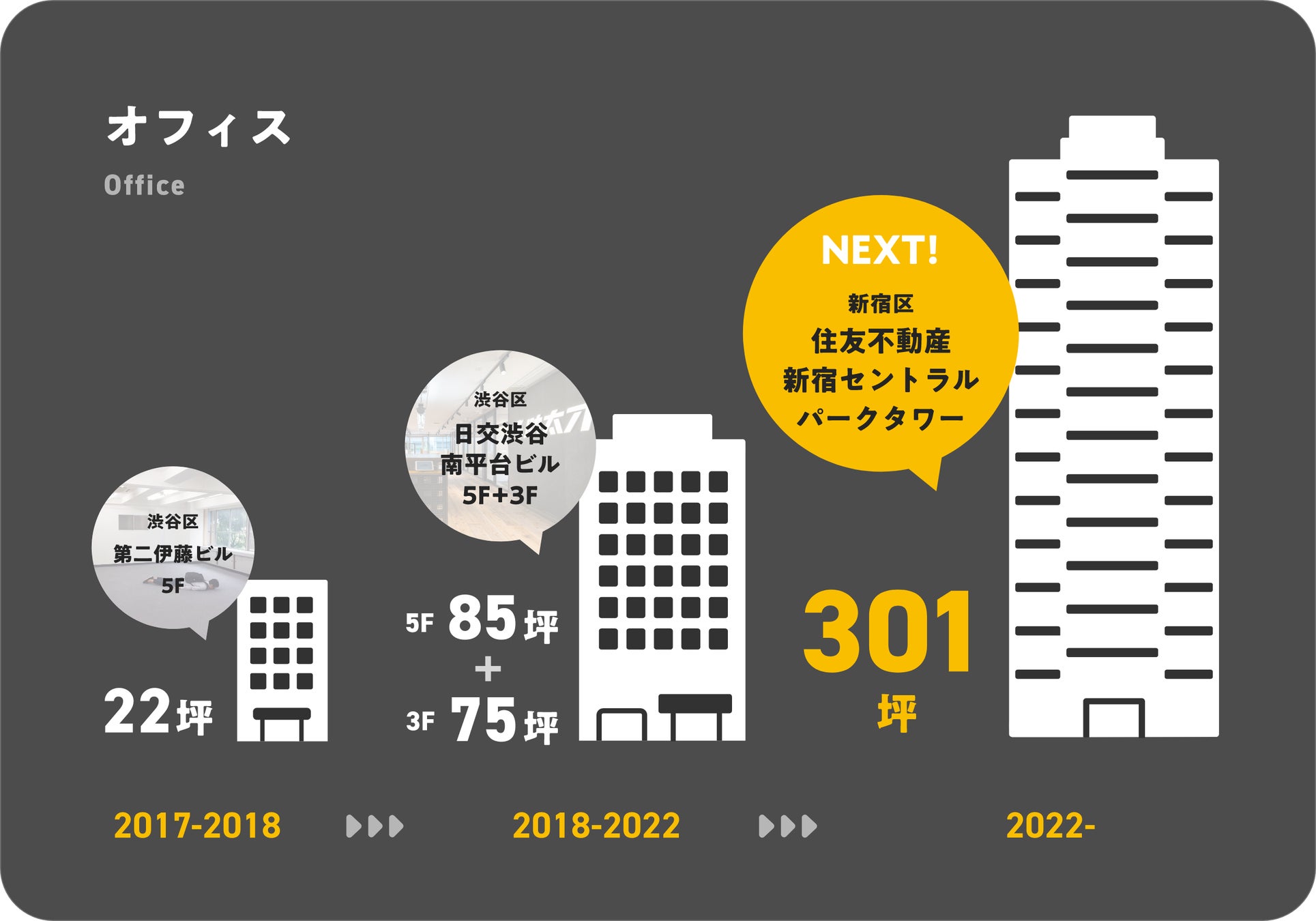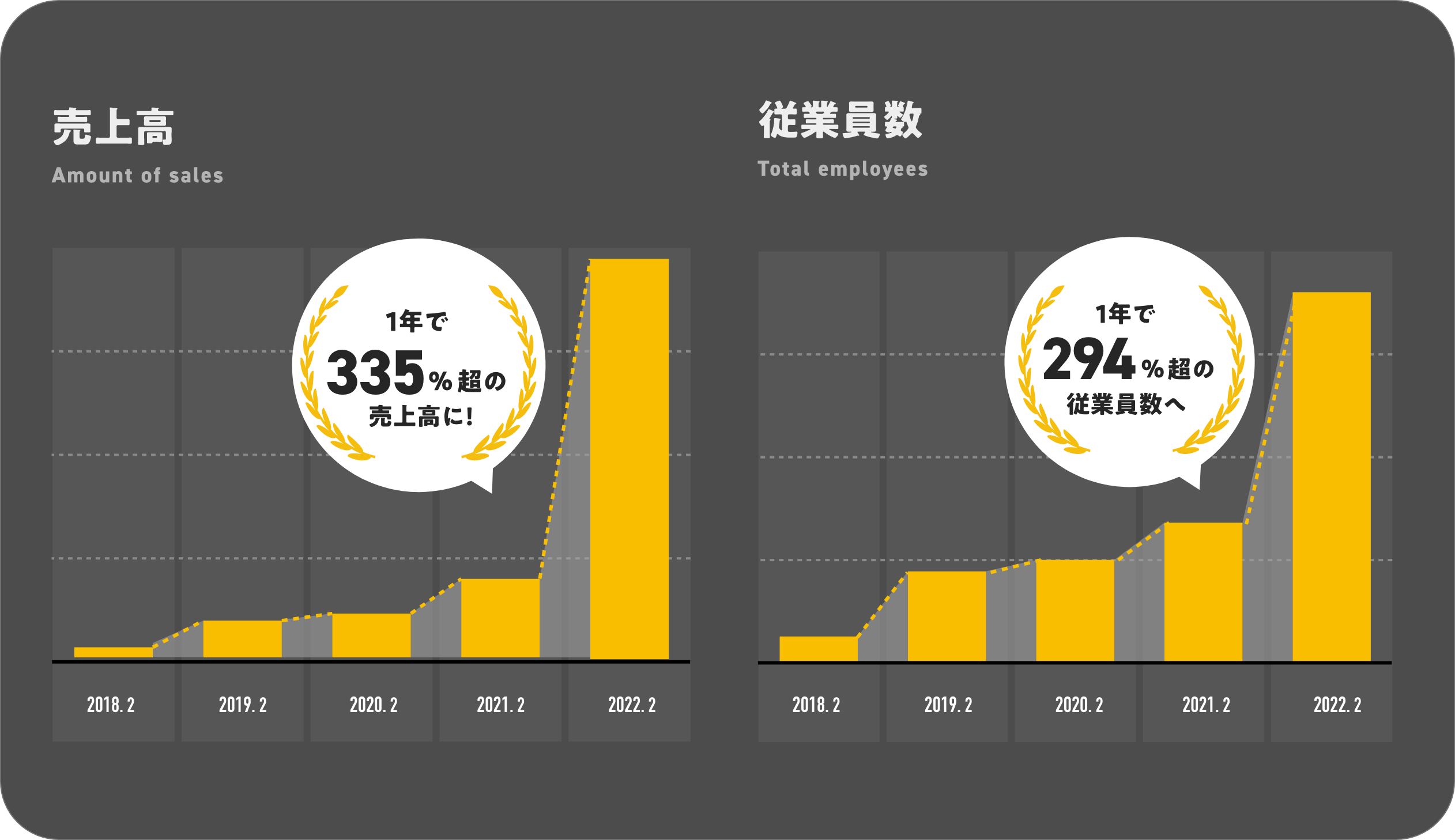 2022年2月期は昨年対比で売上高は約3.4倍、従業員数は約3倍の成長を達成いたしました。2022年8月には300坪超のオフィスに移転いたします。今後も引き続き、意欲的な事業成長の実現に向けて尽力してまいります。