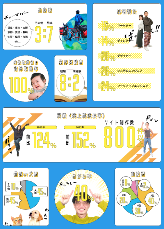 採用サイトによくある「平均年齢」や「男女比」だけでなく、「めがね率」など、より親しみを持ってもらえるよう、遊び心を入れたのもポイントです。