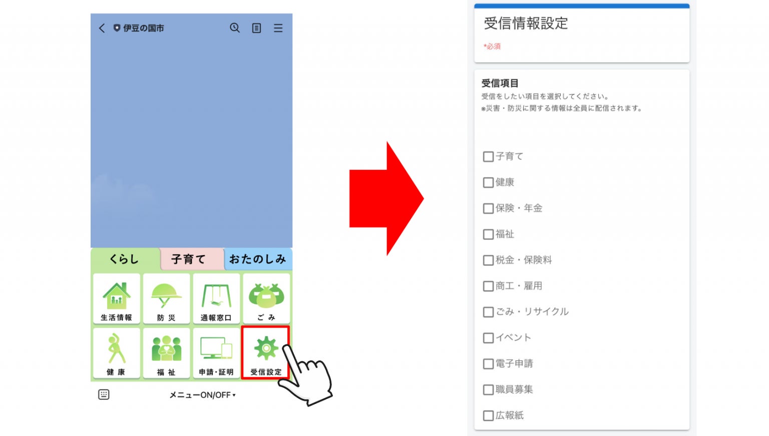 これまではLINEに登録している全ての住民に送られていた配信ですが、リニューアル後からは欲しい配信カテゴリーを選択することができます。